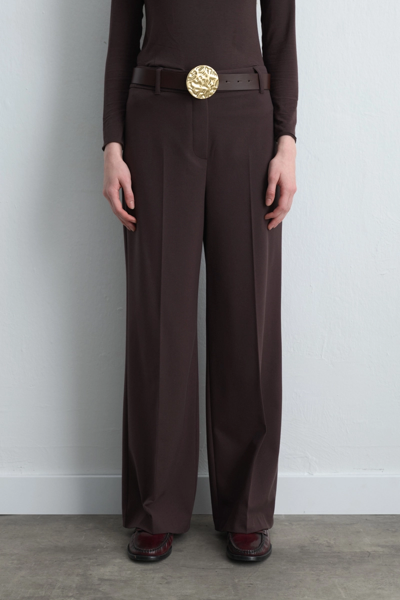 This high-waist palazzo pant offers a modern and sophisticated appearance, adding warmth to seasonal outfits with its brown tone. Its wide cut ensures both comfort and an elegant stance. Suitable for office chic or casual style. When paired with a blazer, it creates a strong and stylish look.