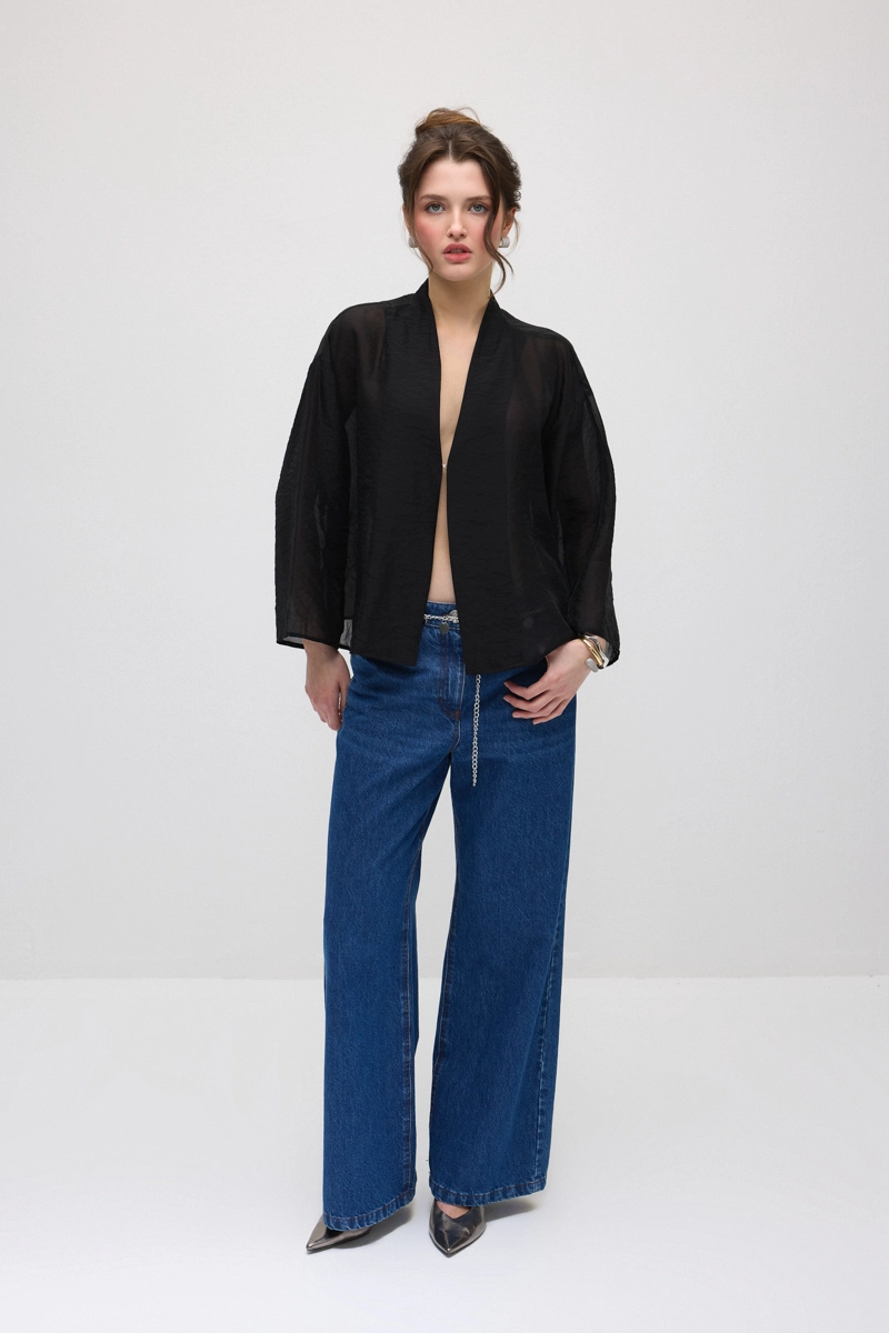 With its transparent and lightweight organza fabric, this piece offers an elegant and eye-catching look. Safety pin details add a modern and chic touch. Its lightweight structure makes it easy to layer. Suitable for daily style as well as special occasions. Its sophisticated appearance completes your look.