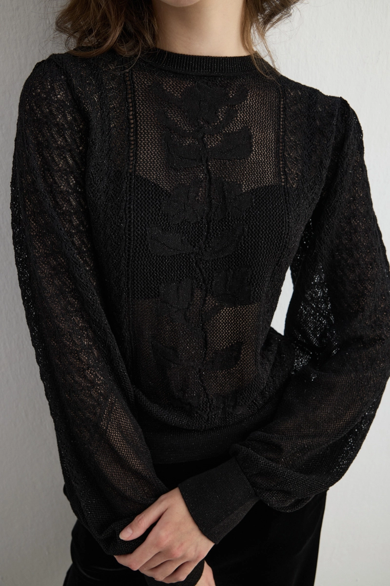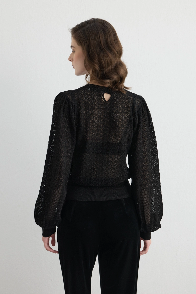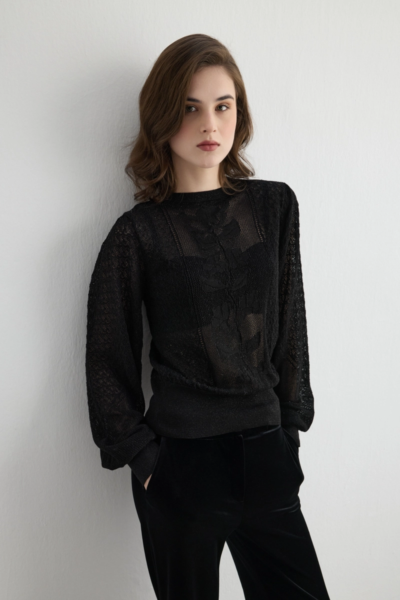 Light openwork details provide a modern and elegant look. Balloon sleeves create a feminine silhouette. Black tones coordinate with any outfit. Knit texture offers comfort while maintaining style. Easily adaptable to daily and office wear. When paired with minimal accessories, the style stands out.