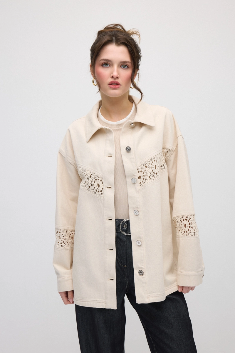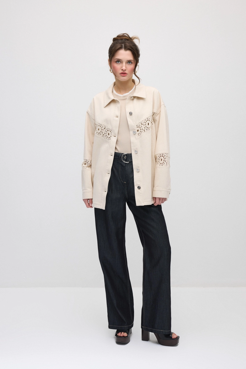 Canvas texture provides a durable and chic look. Lace-garnished details add an elegant touch to the design. Relaxed cut ensures modern and comfortable wear. A complementary piece for daily outfits.