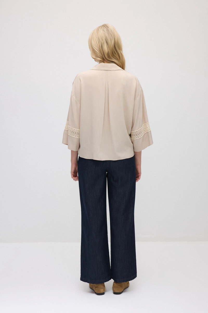 Lace details provide an elegant and feminine look. Viscose fabric ensures lightweight and comfortable wear. Suitable for daily wear as well as chic combinations. Modern cut pairs easily with different pieces. Neutral tone adds a delicate touch to your style.