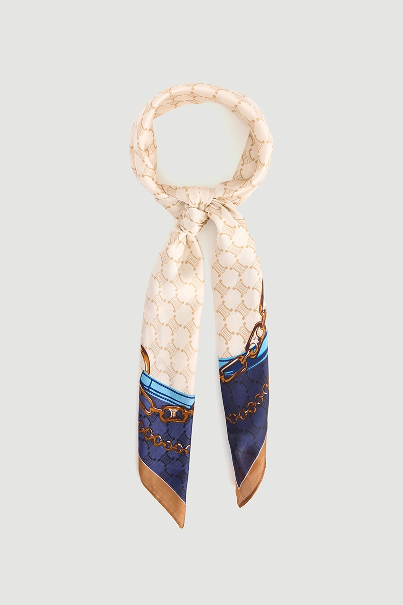 The large scarf with brown background and chain patterns stands out as a sophisticated accessory. Its generous size allows use on the shoulder or neck, adding a modern touch to your outfits.