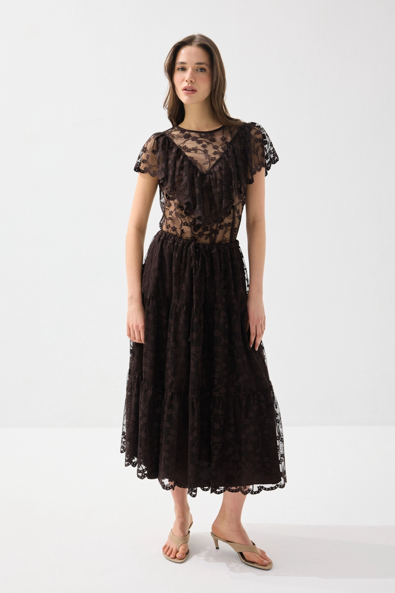 Featuring lace details, this piece offers an elegant and stylish look. Its long cut creates a feminine silhouette. The brown tone provides a warm and natural style. Suitable for both daily and special occasion outfits.