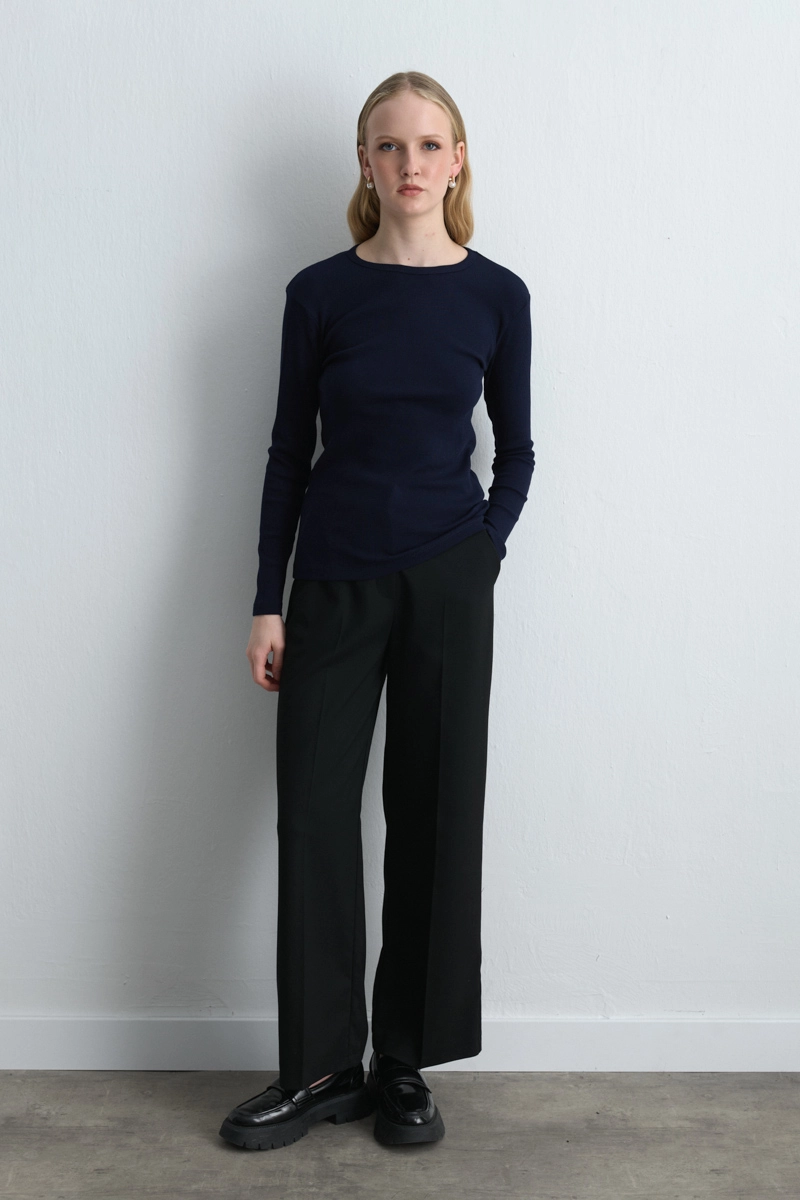 This long-sleeved navy cotton T-shirt is perfect for cooler days, offering compatibility with any style through its basic form. The soft cotton texture provides all-day comfort, while the minimalist design allows easy layering. An ideal choice to complete your casual style with timeless elegance.