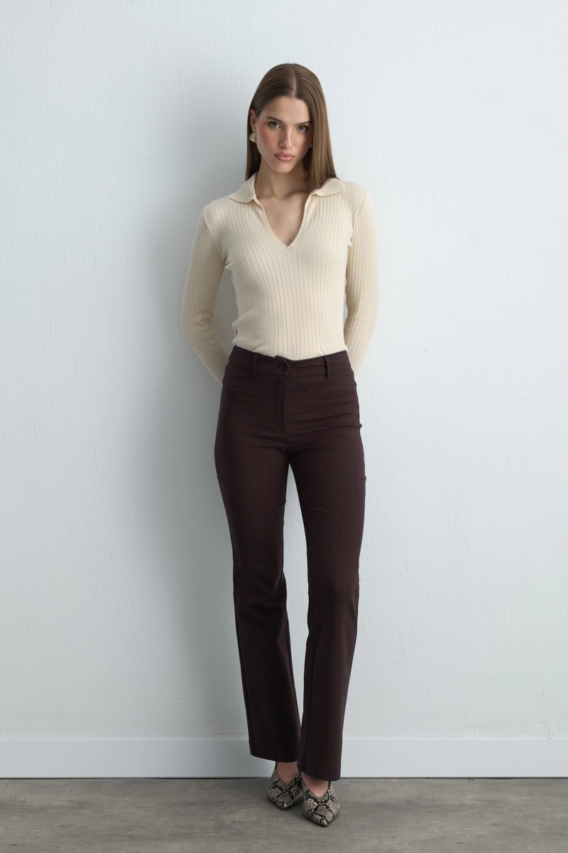 The modern flare cut elegantly enhances the silhouette. The brown tone can be easily styled for both formal and casual outfits. Its stretchy texture increases comfort while maintaining a polished look. Pairs perfectly with blazer jackets for a seamless ensemble.