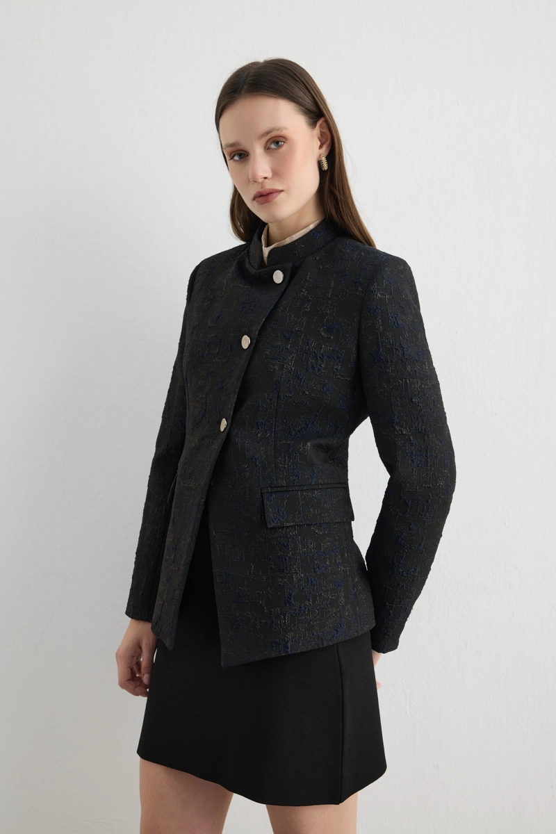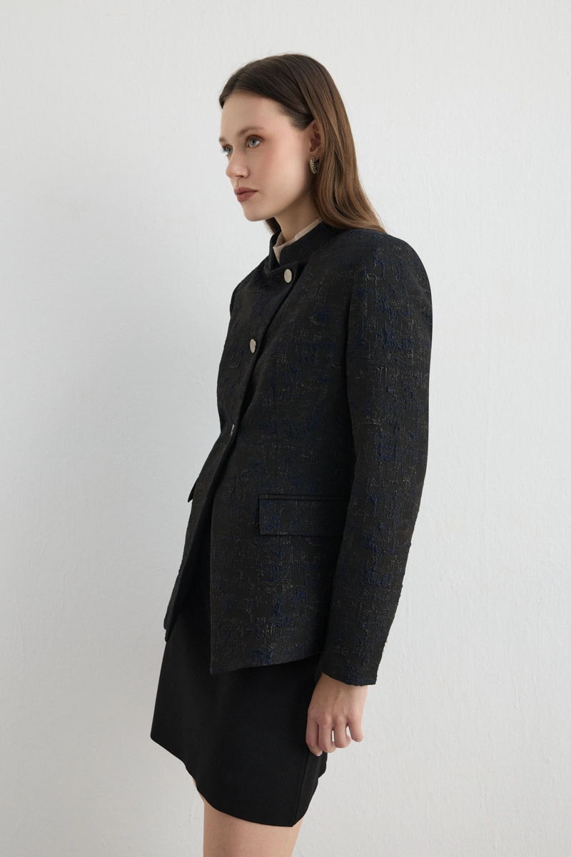 Black color provides a serious and sophisticated look. Jacquard texture adds depth and sophistication to the details. The stand collar creates a modern vibe. Easily suitable for work or special event outfits. Minimal accessories enhance elegance. Offers a confident style for any occasion.