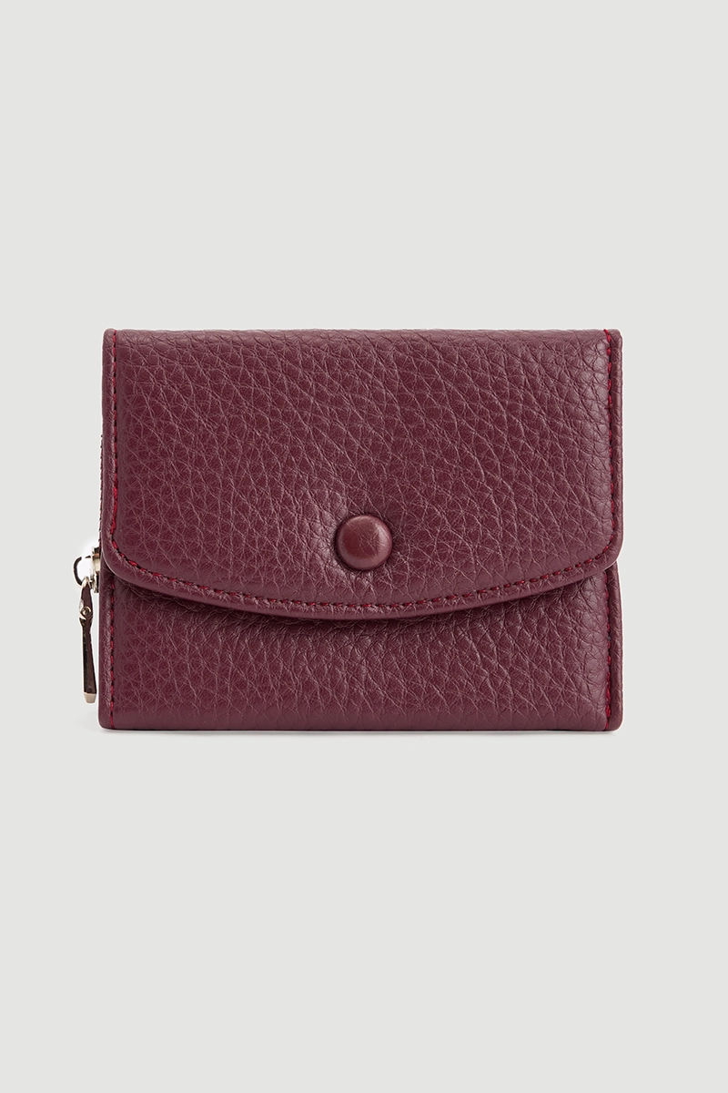 This mini wallet, highlighted by an energetic plum tone, features zipper details for a modern look. Its small size makes it easy to carry in a bag, and functional compartments provide practicality. Enhances style for both daily and evening outfits.