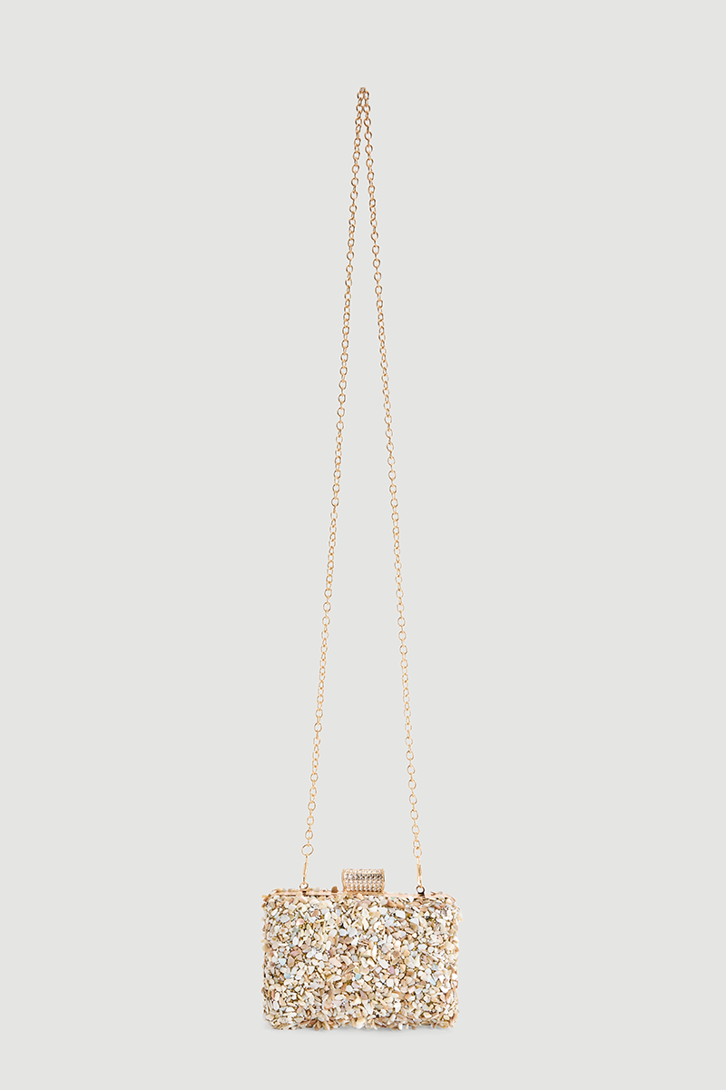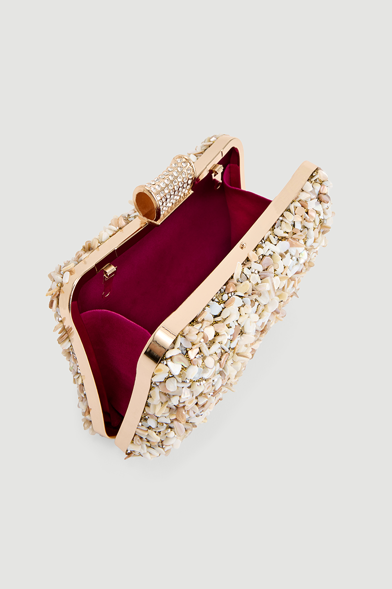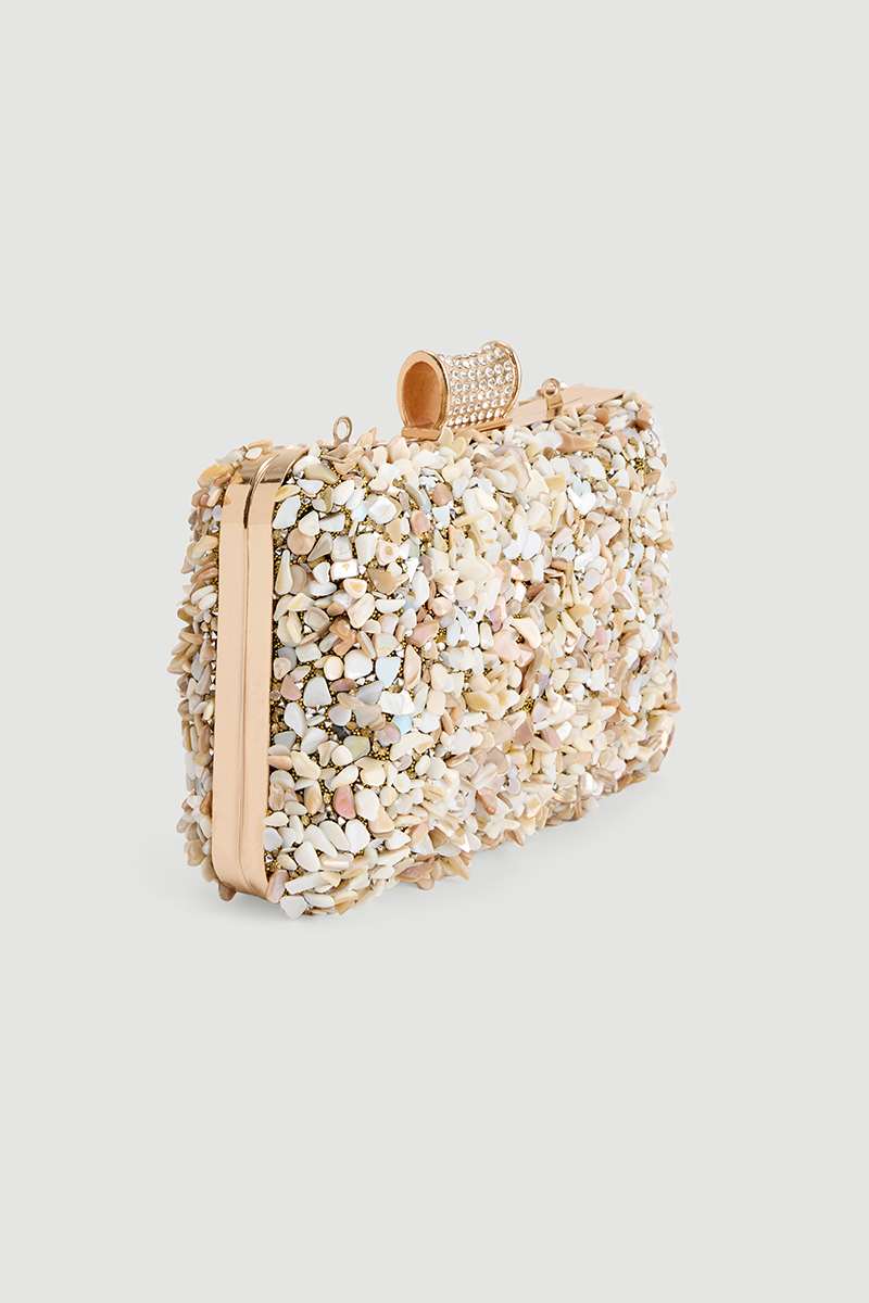 Creates a sophisticated sparkle with mother-of-pearl details. Gold tones highlight elegance. Clutch form allows easy carrying at events. Leaves a refined and eye-catching impression.