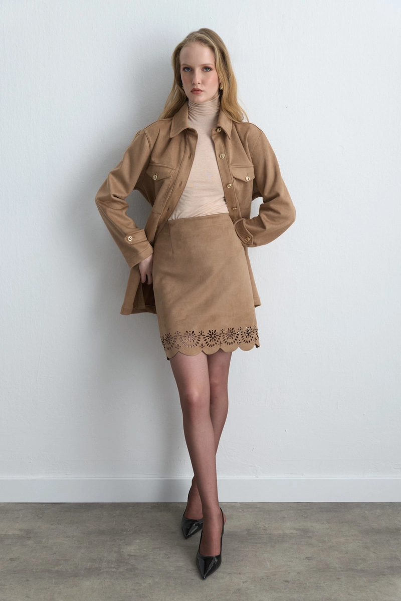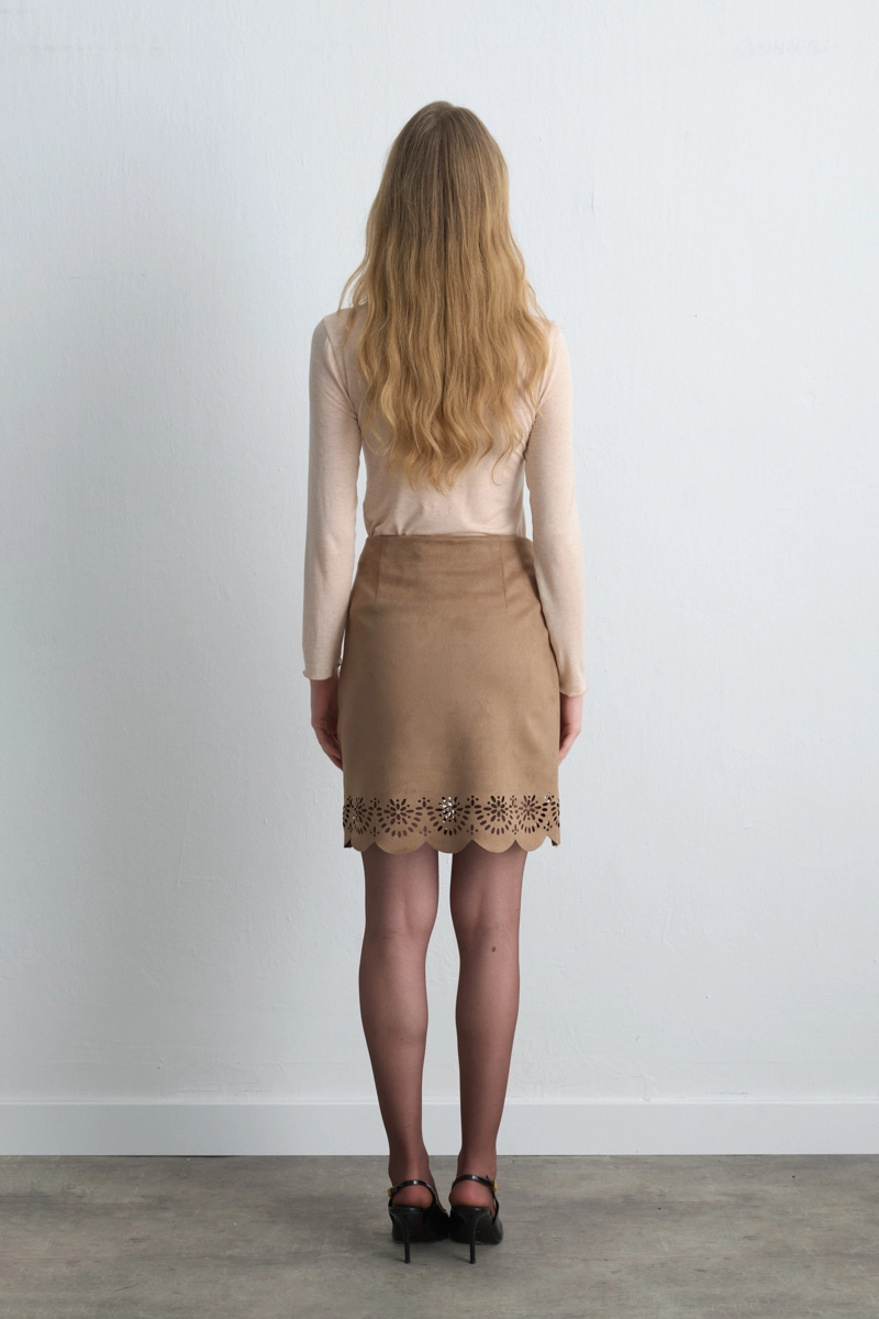 This skirt stands out with its soft suede texture and motif details, offering natural elegance with its camel tone. Its design, a blend of modern and bohemian style, works well with various outfits. Pairs perfectly with boots, ankle boots, or knitted sweaters. Ideal for transitional seasons and a unique piece.