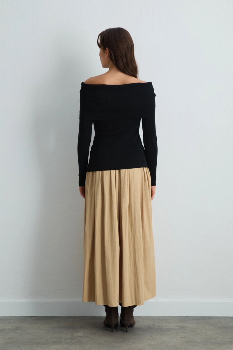Feminine Madonna-neck knit blouse highlights the shoulders to create an elegant silhouette. The soft and stretchy knit fabric fits the body for a chic look. Suitable for everything from evening events to daily style.