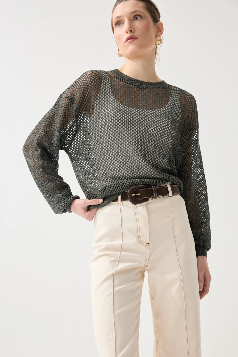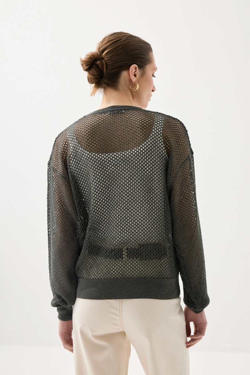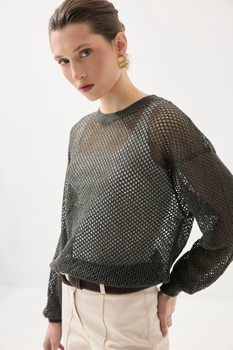 This viscose knit blouse, featuring openwork details, offers an elegant and feminine look while ensuring comfortable wear with its lightweight structure. Its breathable fabric provides freshness throughout the day. With its stylish texture, it can be easily preferred for both daily and special combinations. Its soft texture leaves a pleasant feel on the skin, while its modern cut adds a refined touch to your style. It is set to become one of the standout pieces in your wardrobe.