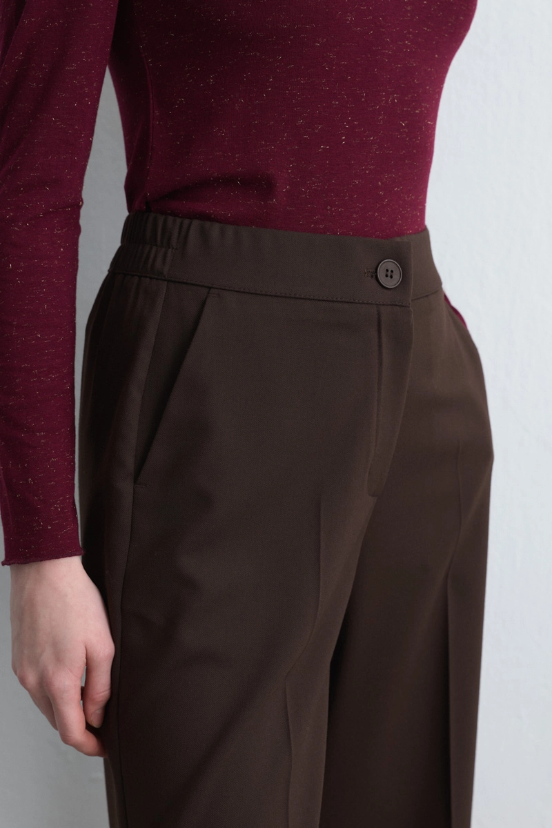 This brown palazzo pant, noted for its elegant stance, offers a sophisticated look with its wide-leg design. A timeless piece suitable for both office combinations and stylish events. Complements your style when paired with blouses and jackets.