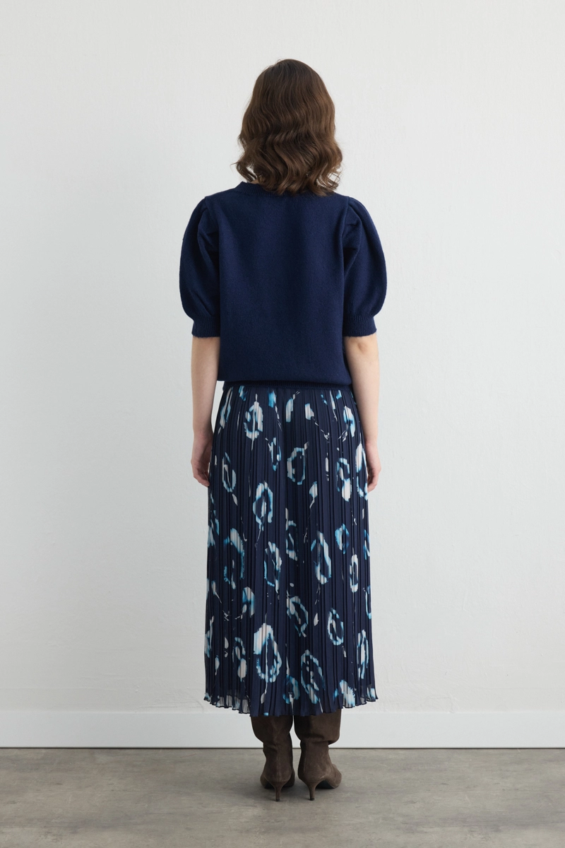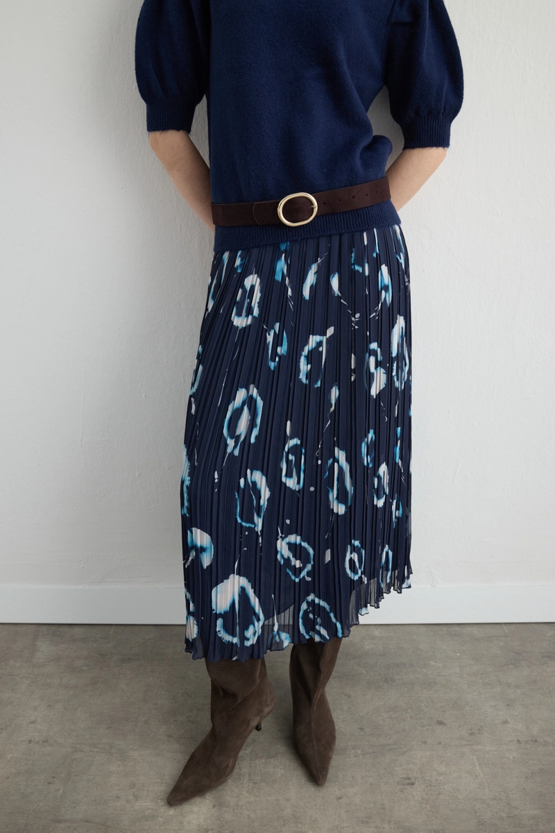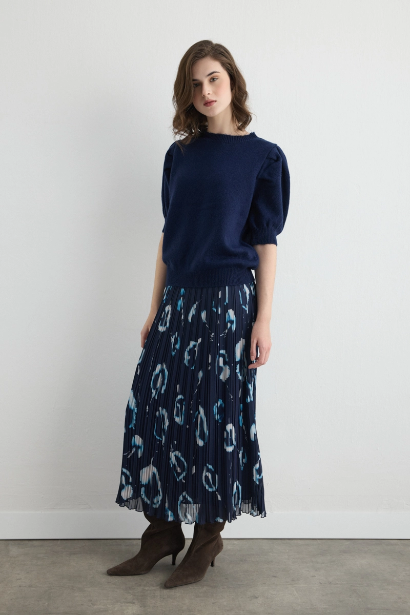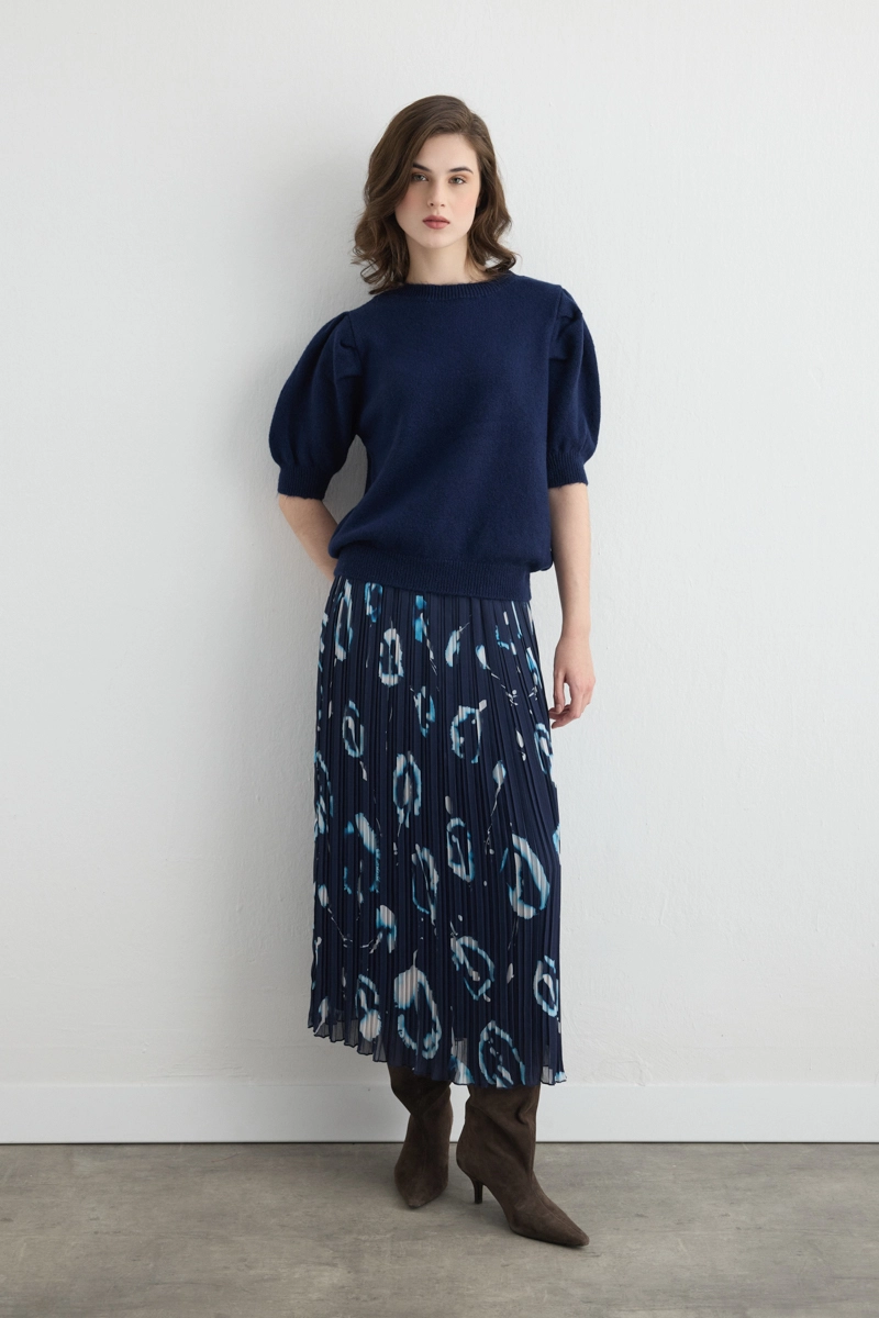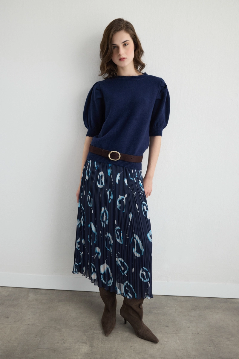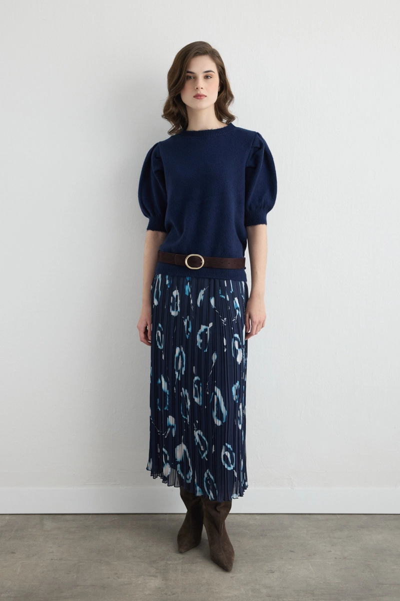 Pleated cut adds movement and volume. Navy tones create a classic and sophisticated effect. Patterned surface adds depth and character to the outfit. An elegant choice for daily or office styling. Lightweight texture ensures comfortable wear. When paired with minimal tops, elegance is highlighted.