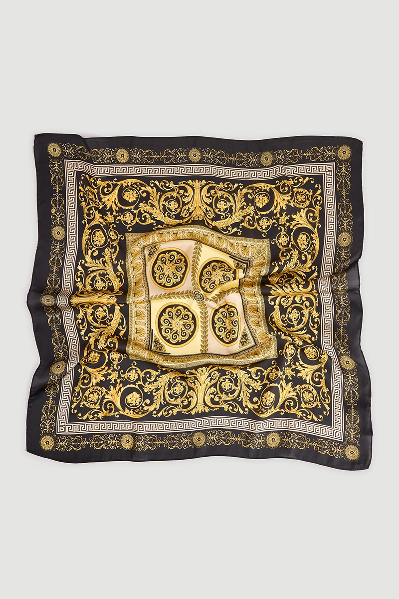 The scarf in bright yellow with delicate patterns adds energy to your style. Its lightweight fabric allows versatile use as a neck, shoulder, or bag accessory. An ideal complement for those who want to add color and movement to their outfits.