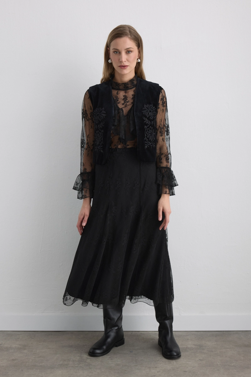 The delicate lace texture adds a feminine touch. Its long form creates an elegant silhouette, and the inner lining ensures comfortable wear. Suitable for styles from everyday chic to special event outfits.