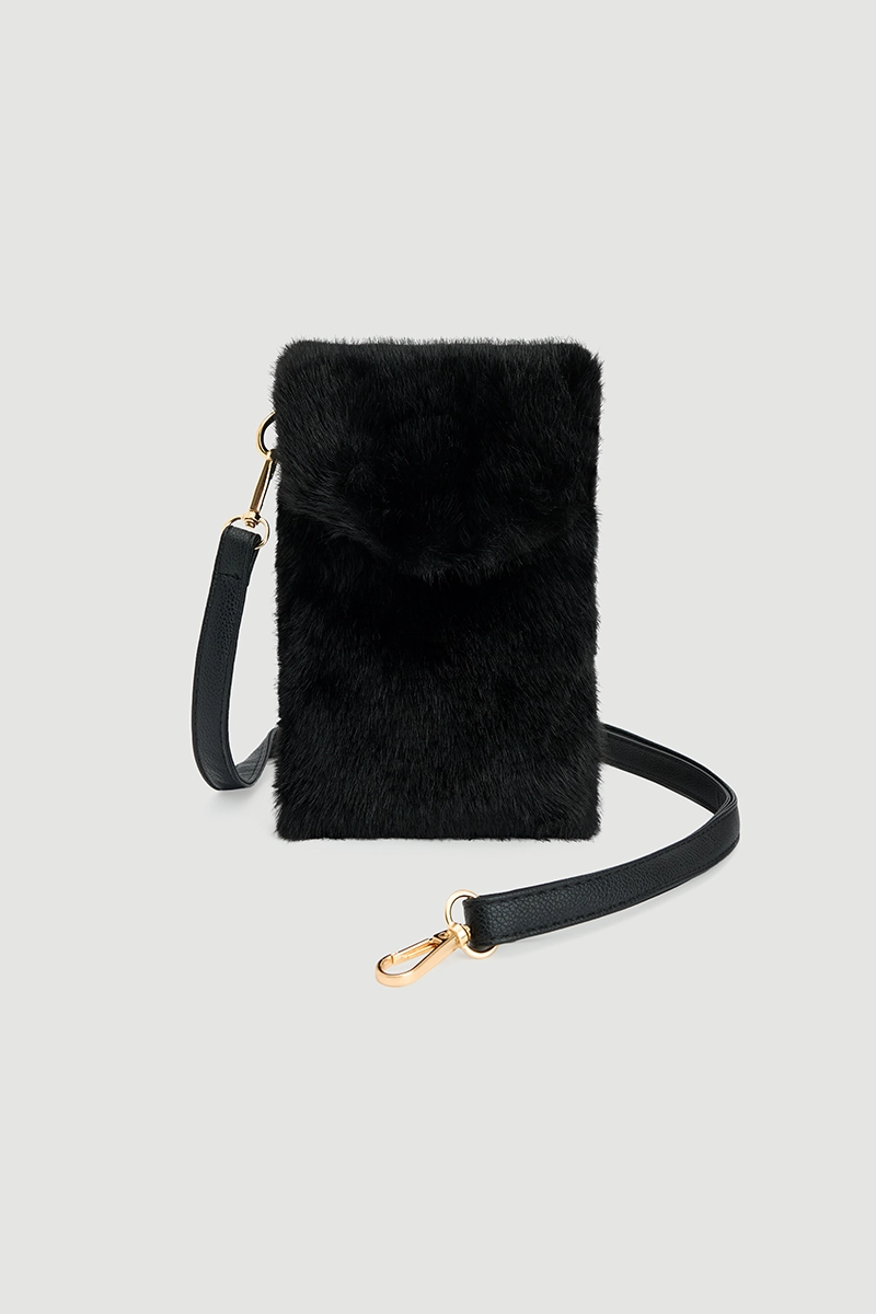 The plush texture creates a soft and eye-catching effect. The phone holder form offers practical use. The black color matches any outfit. It creates a functional alternative for everyday style. Its lightweight structure ensures comfortable carrying. It offers a stylish and modern accessory.