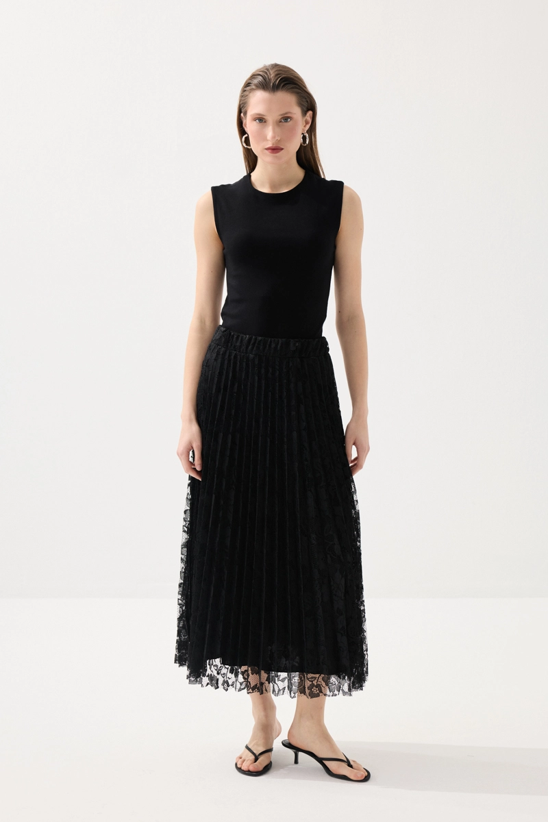 Pleated form and lace details create an elegant and feminine look. Flowing shape forms a chic silhouette while walking. Suitable for daily wear as well as special occasions. Modern and elegant design pairs easily with different tops. Timeless form completes your style.
