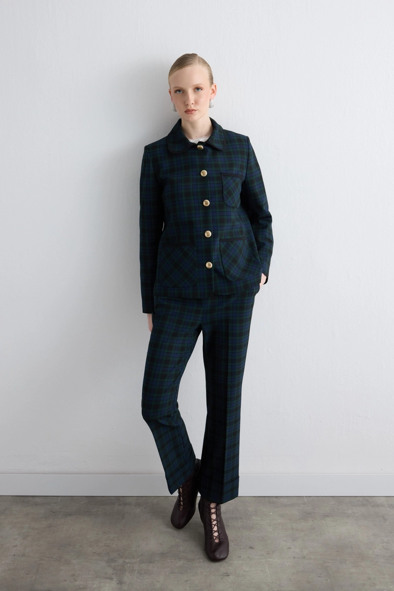 Checkered pattern combines classic and modern styles. Pocketed design offers both functionality and elegance. Navy color pairs easily with various bottoms. Lightweight structure ensures comfort. Stands out in daily and office combinations.
