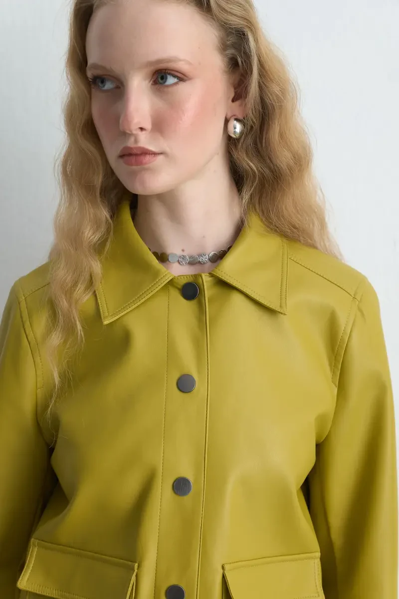 Its Modern Design Creates An Energetic Silhouette. Faux Leather Offers A Cool Look While The Snap Detail Adds Practicality. The Green Tone Adds A Dynamic Touch To Outfits. Suitable For Both Daily And Evening Looks.