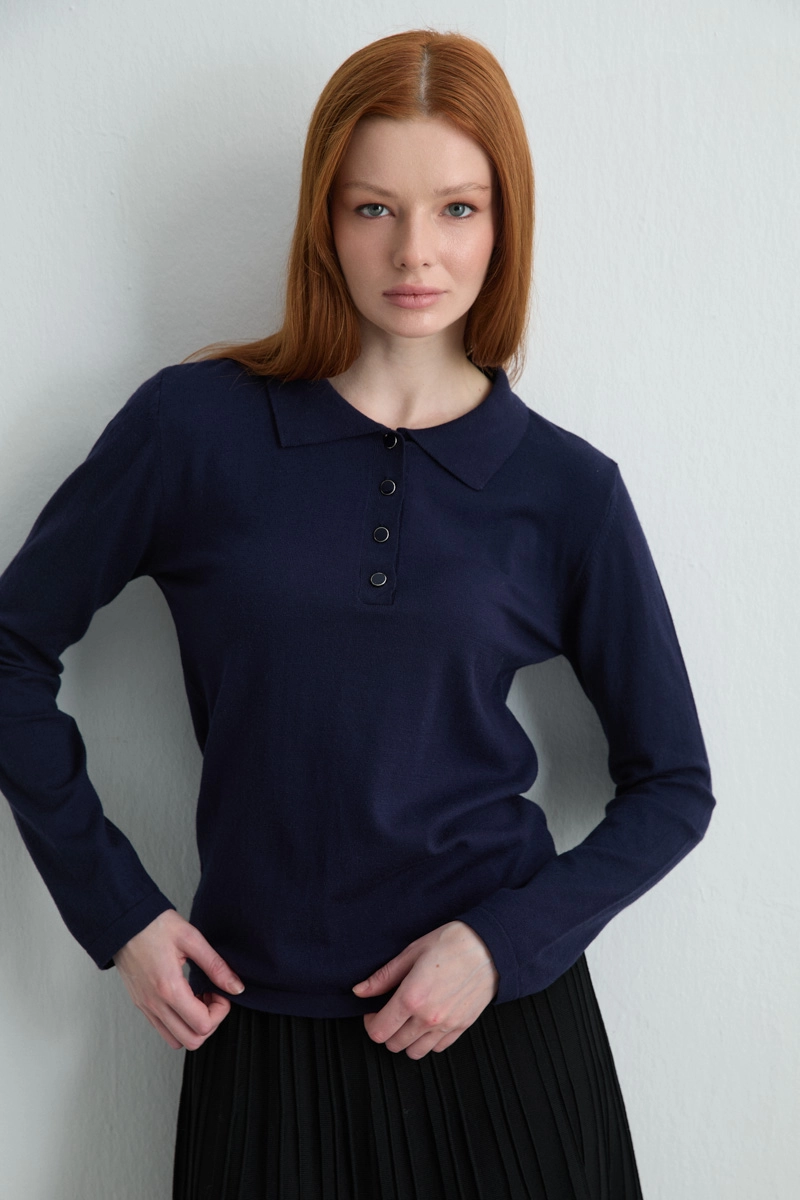 This polo-neck knit blouse in navy exudes sophistication with its minimal button details. It is an ideal choice for both office outfits and everyday elegance. The knit fabric maintains its shape while providing comfortable wear.