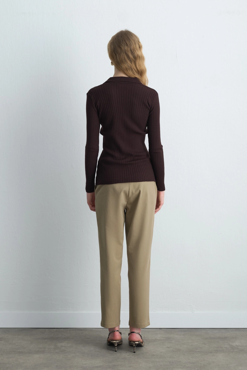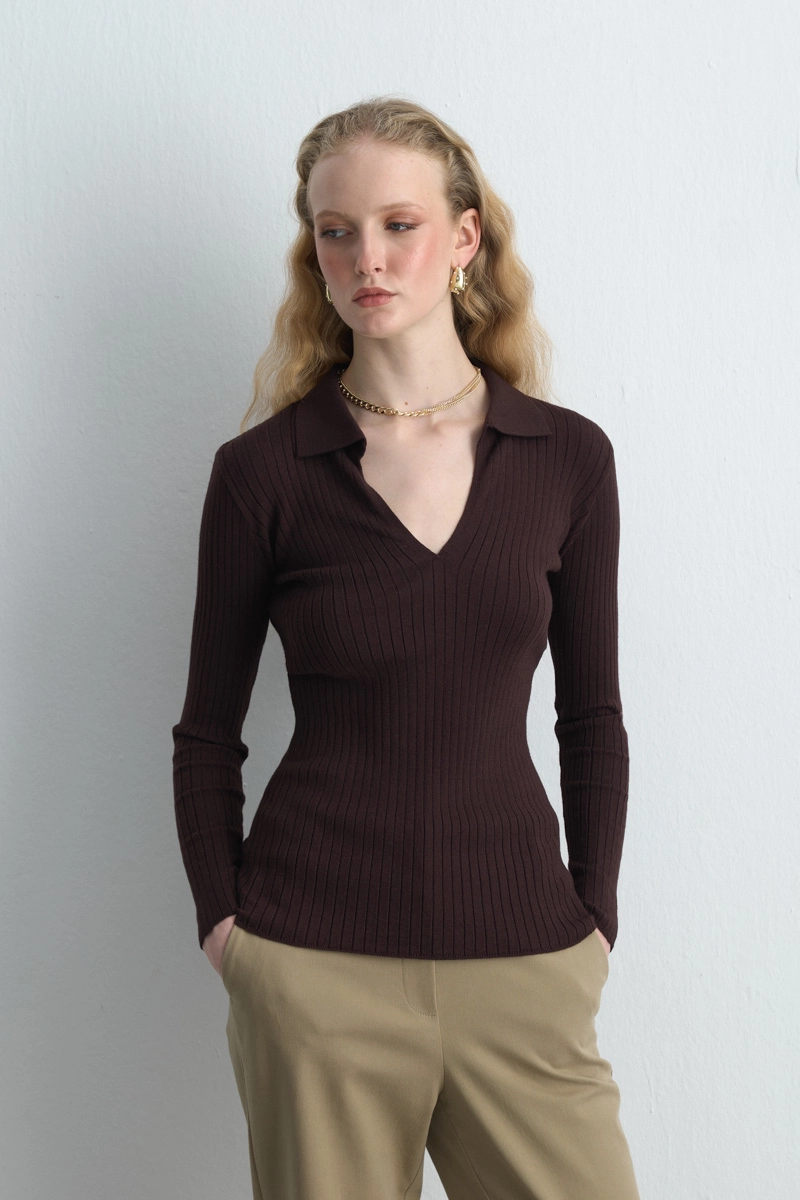 It Adds A Sophisticated Look With Its Warm Coffee Tone. The Polo Collar And Ribbed Texture Combine Classic And Modern Lines. Its Comfortable Structure Makes It Suitable For Both Office And Casual Looks. When Paired With Gold Accessories, Its Elegance Stands Out.
