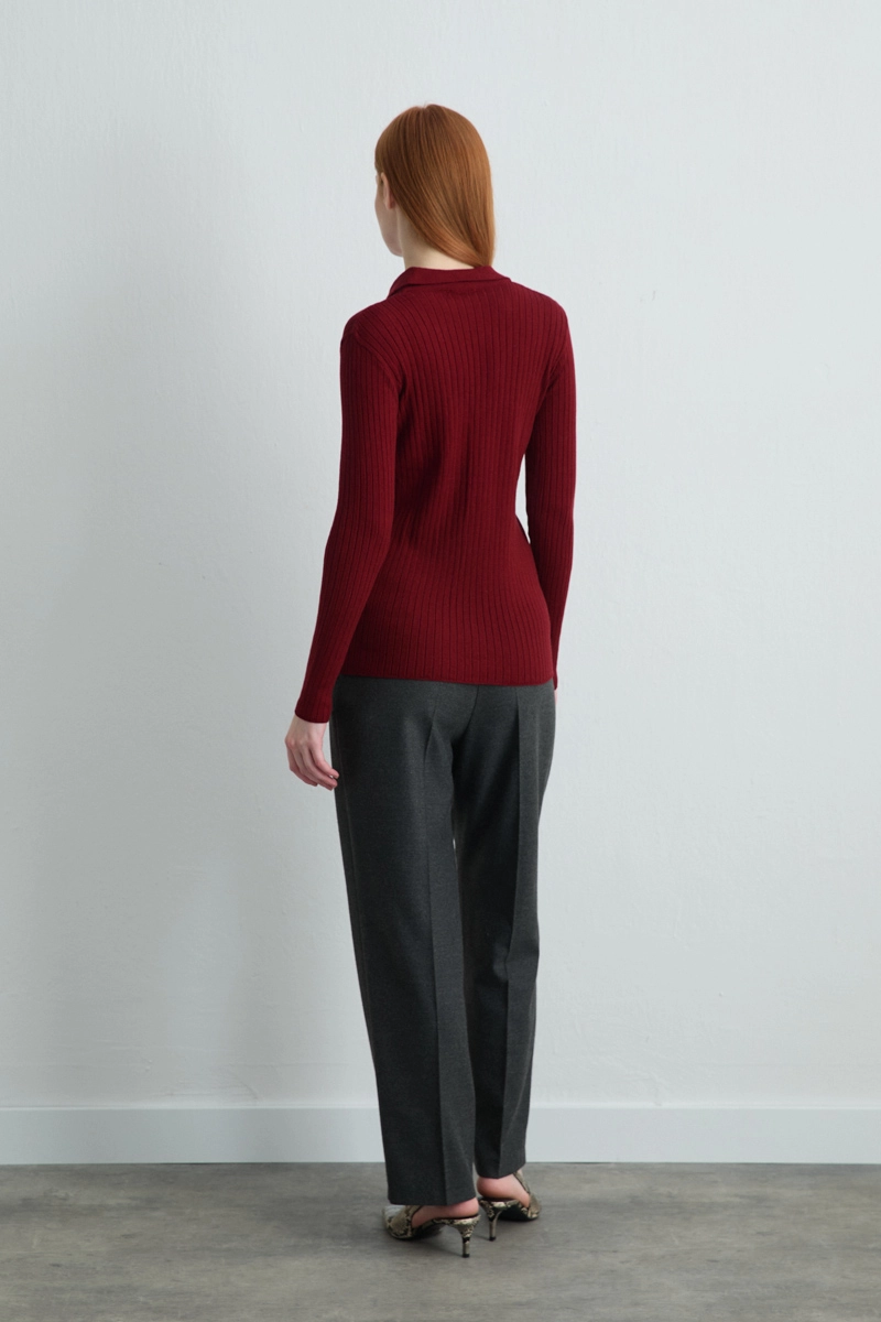Attention-grabbing ribbed knit blouse in vibrant burgundy features a delicate polo collar for a classic touch. The body-hugging stretch fabric combines comfort and style, suitable for daily outfits or casual office looks.