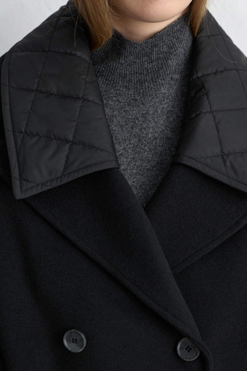The wool texture provides a warm and comfortable feel. The quilted collar stands out as a modern detail. Easily adapts to any style with its black tone. Its long form creates an elegant and urban appearance. Offers style and functionality together during the winter season.