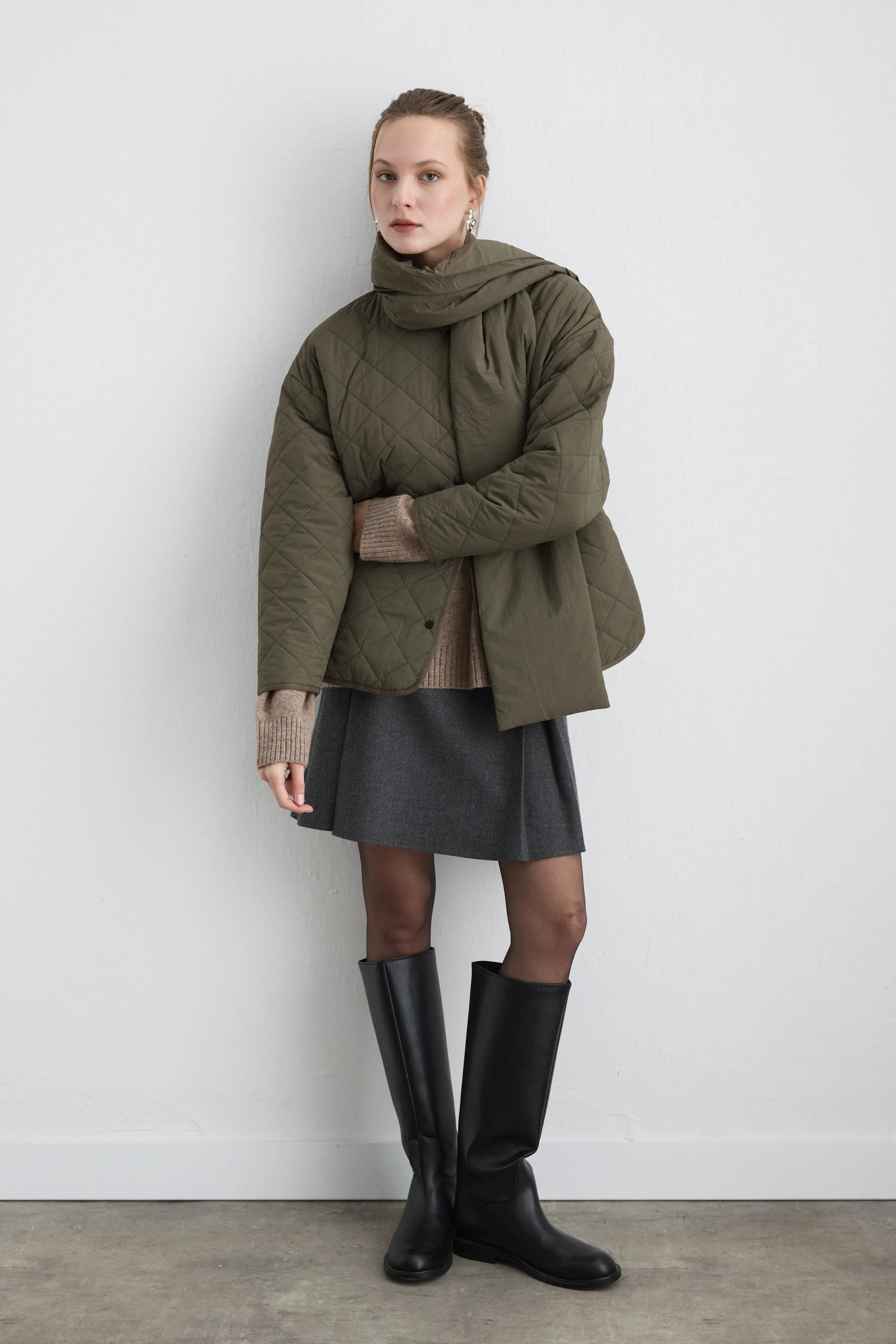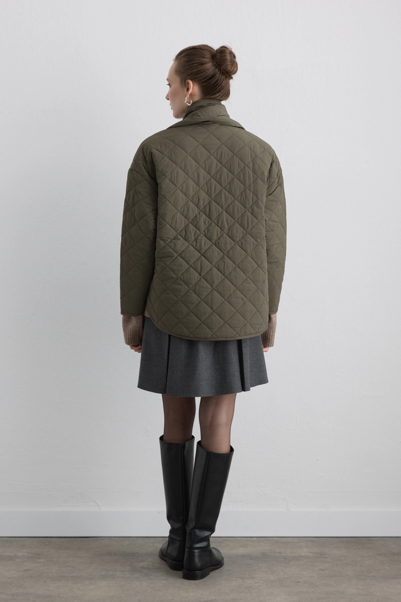 The quilted texture and accompanying scarf detail achieve an elegant harmony. The khaki color offers nature-inspired sophistication, while the padded structure keeps you warm. It is an outerwear option that is both functional and stylish.
