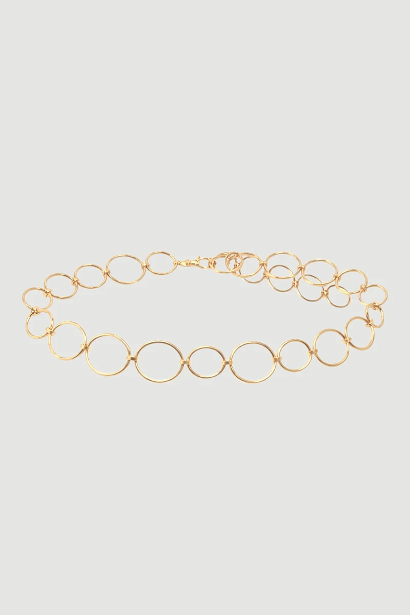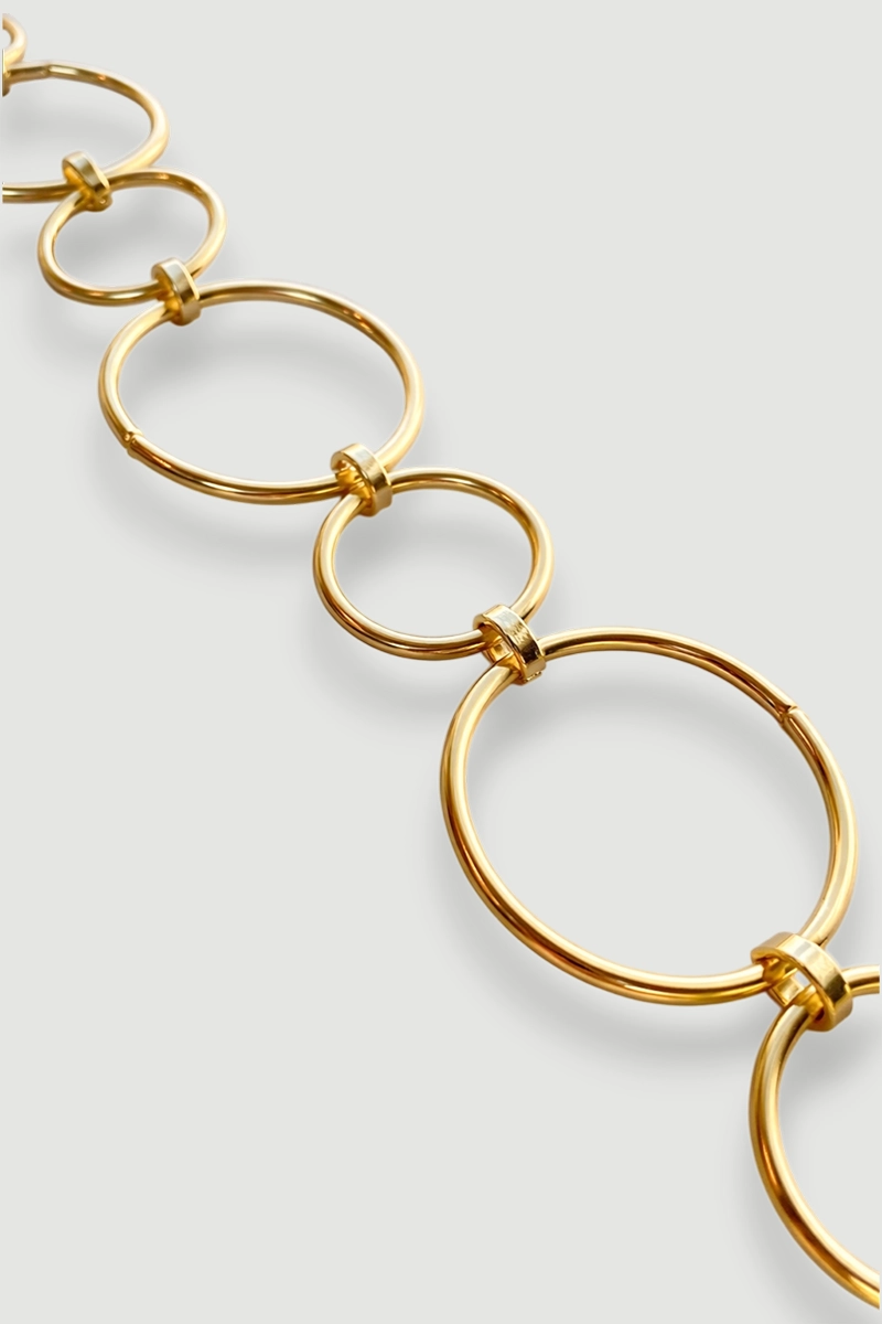 A minimal and bold hoop metal chain belt gives outfits a modern character. The shimmer of the gold tone instantly elevates simple looks. Can be used as a complementary accessory for daily chic or special events.