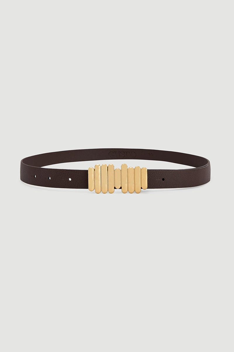 This belt, combining minimal design with a modern interpretation, features a bar-shaped buckle for a chic detail. Its brown tone allows easy pairing with many outfits. Enhances style in both dresses and pants combinations. A timeless piece that will remain in your wardrobe for years.