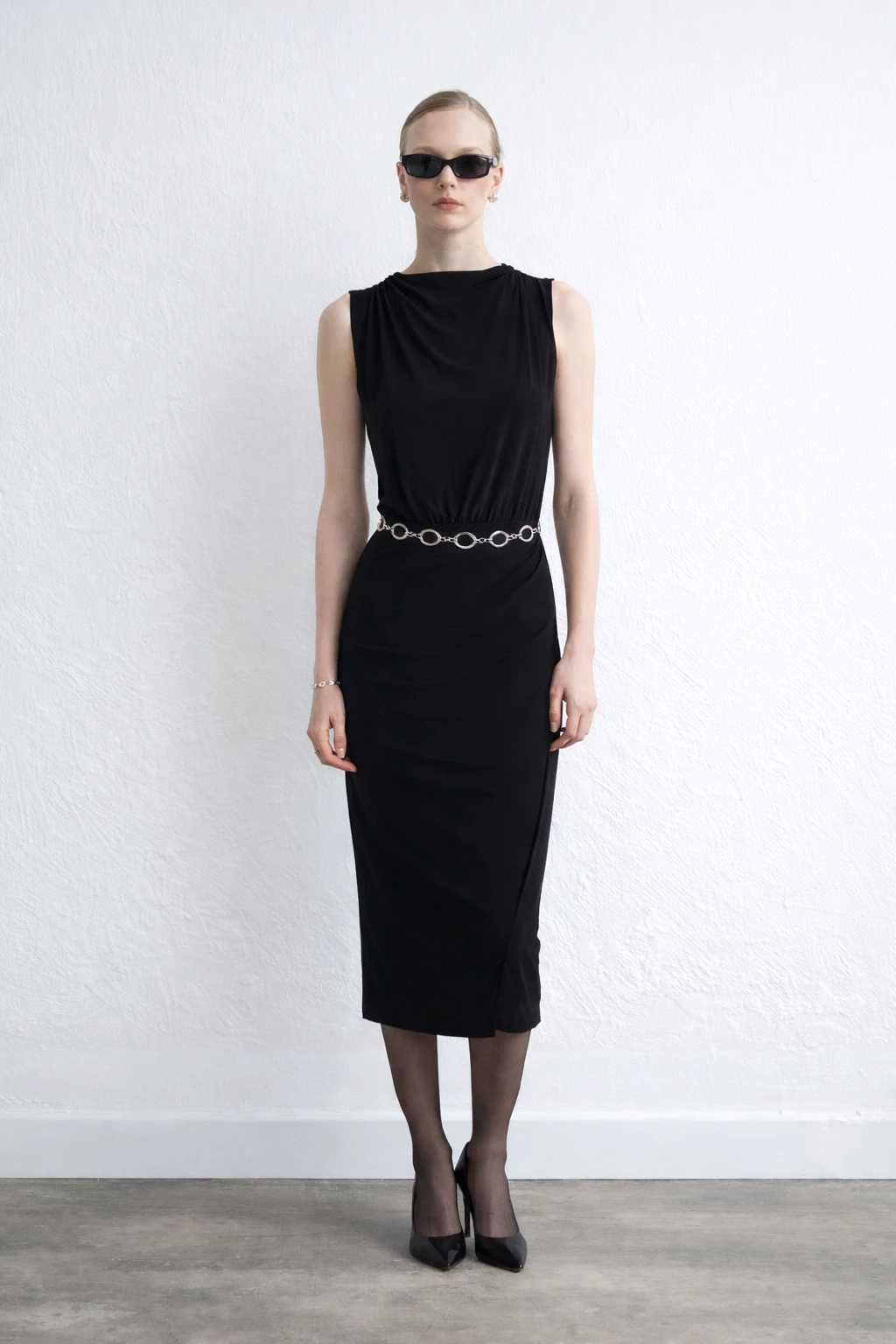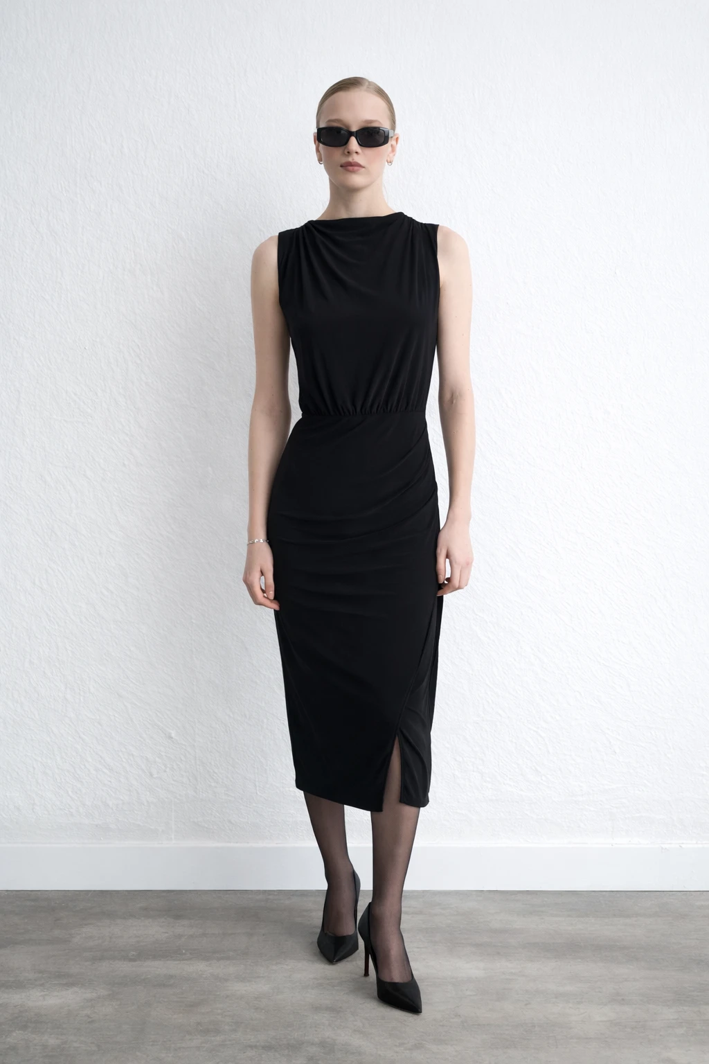 It offers timeless elegance with its black color. The jersey fabric provides comfortable wear with its stretch. The gathered details subtly highlight body lines. Its midi length creates a modern and balanced look. It stands out as a stylish alternative for daily wear and special occasions.