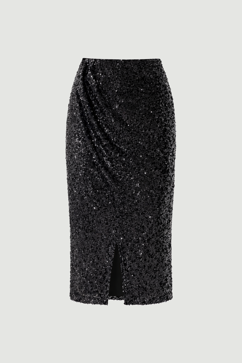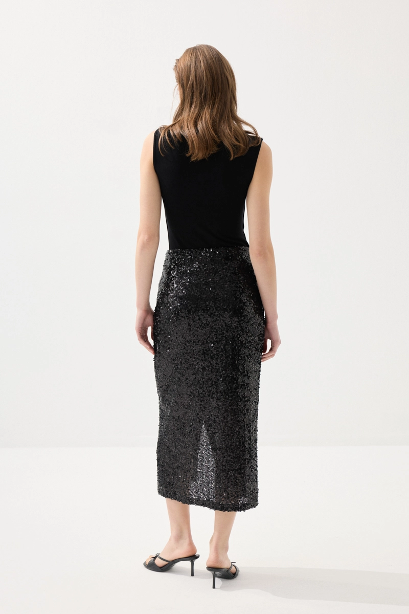 This long evening skirt, offering a dazzling look with its shimmering sequin details, is an essential piece for special occasions. Its elegant cut creates a feminine silhouette. Its fluid structure creates a stylish effect as you move. It can be completed with chic blouses and heels for an impressive look. It is a bold choice for special moments.