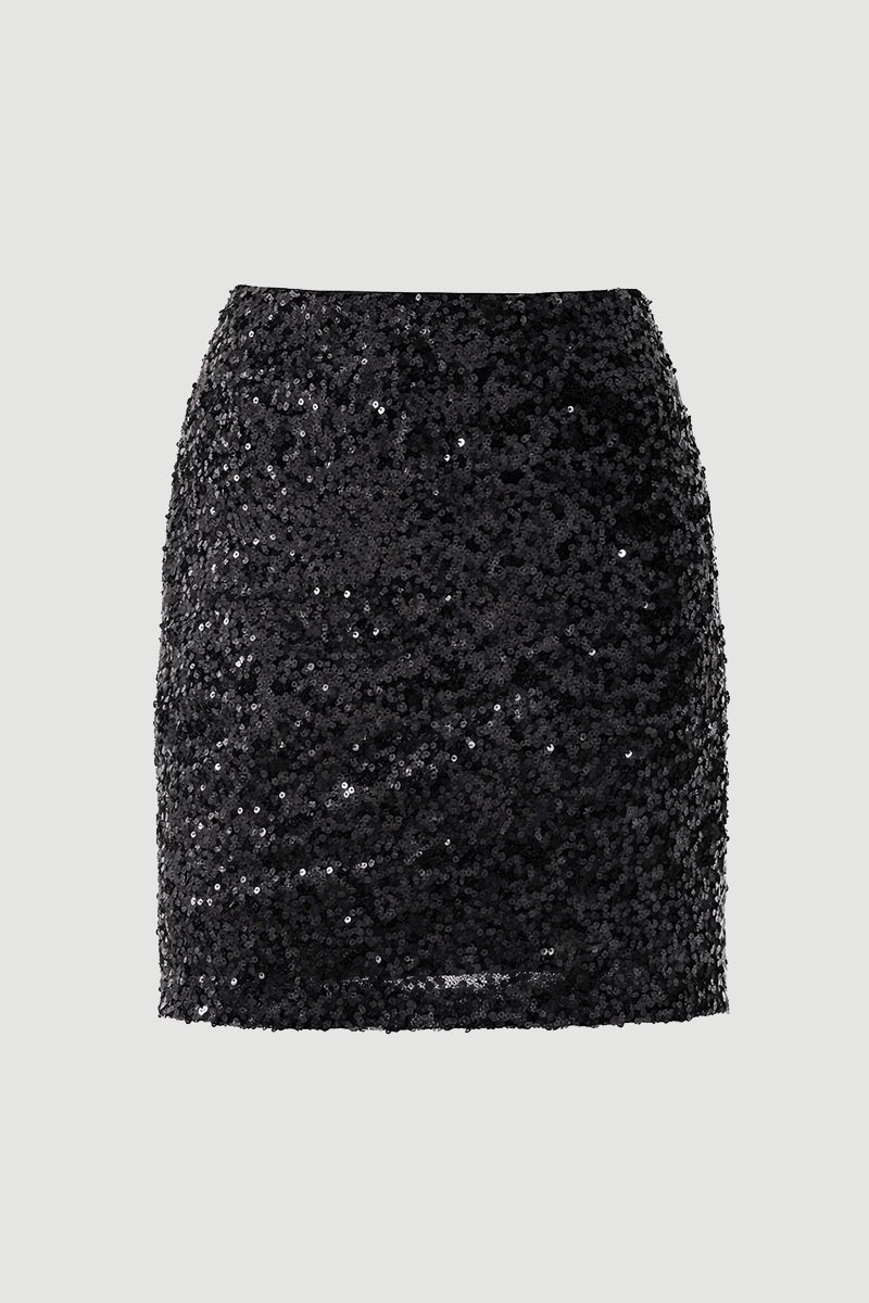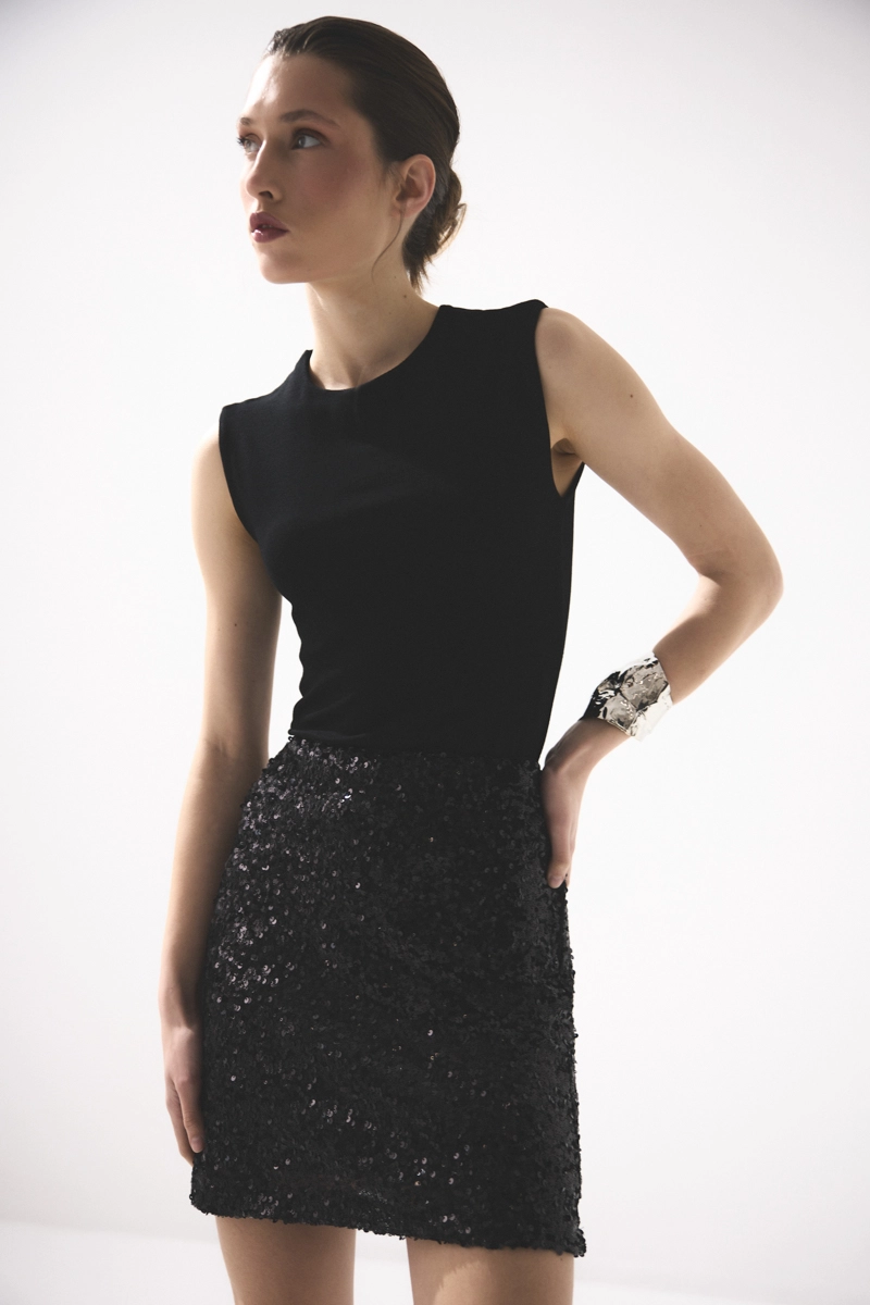 It offers a sparkling look with its sequin details. Its mini cut creates a modern and bold style. The black color provides timeless elegance. It is an ideal piece for special occasions and evening outfits.