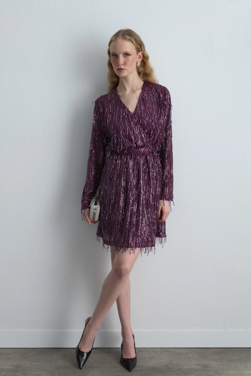 With Its Shimmering Details, It Becomes The Eye-Catching Piece Of Special Invitations. The Wrap-Around Cut Creates An Elegant Silhouette. The Plum Tone Adds A Noble And Bold Elegance. When Paired With Heels And Minimal Accessories, It Offers An Impressive Look.