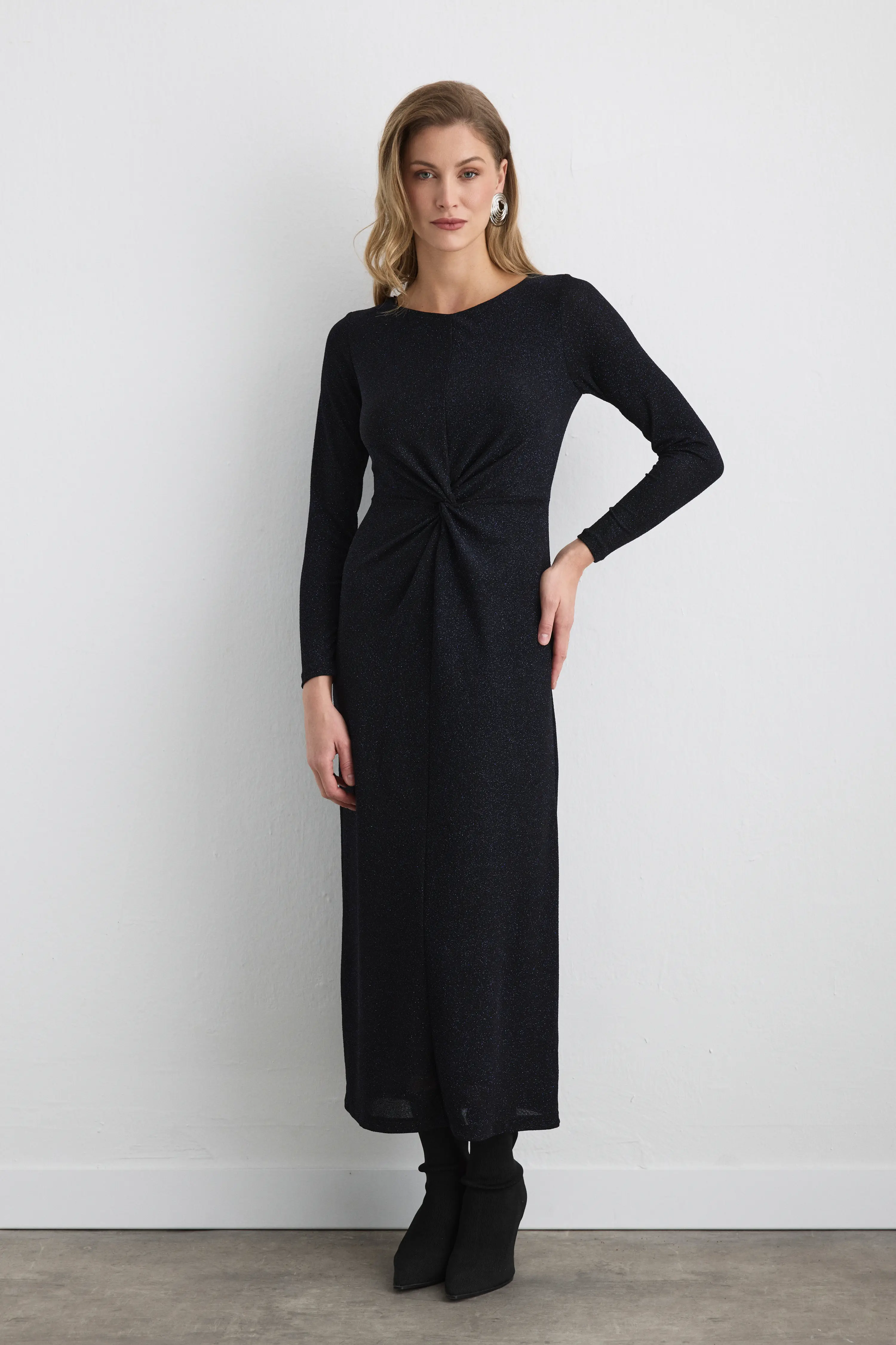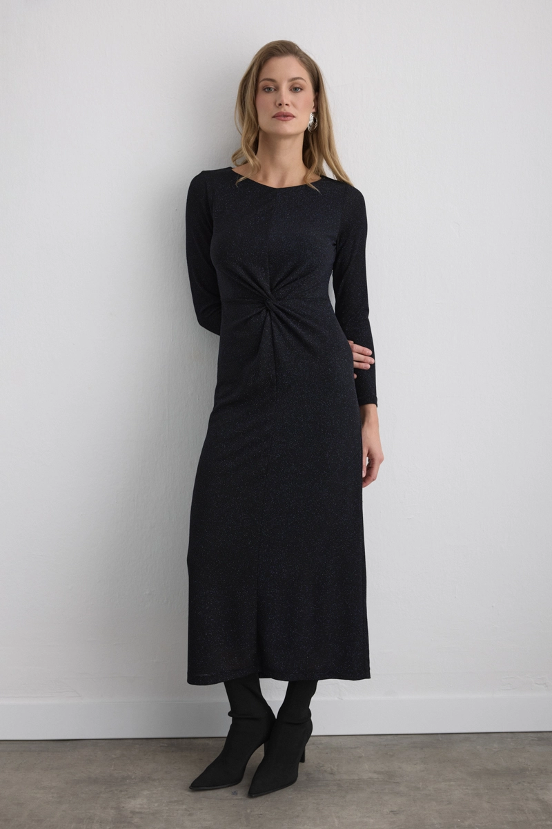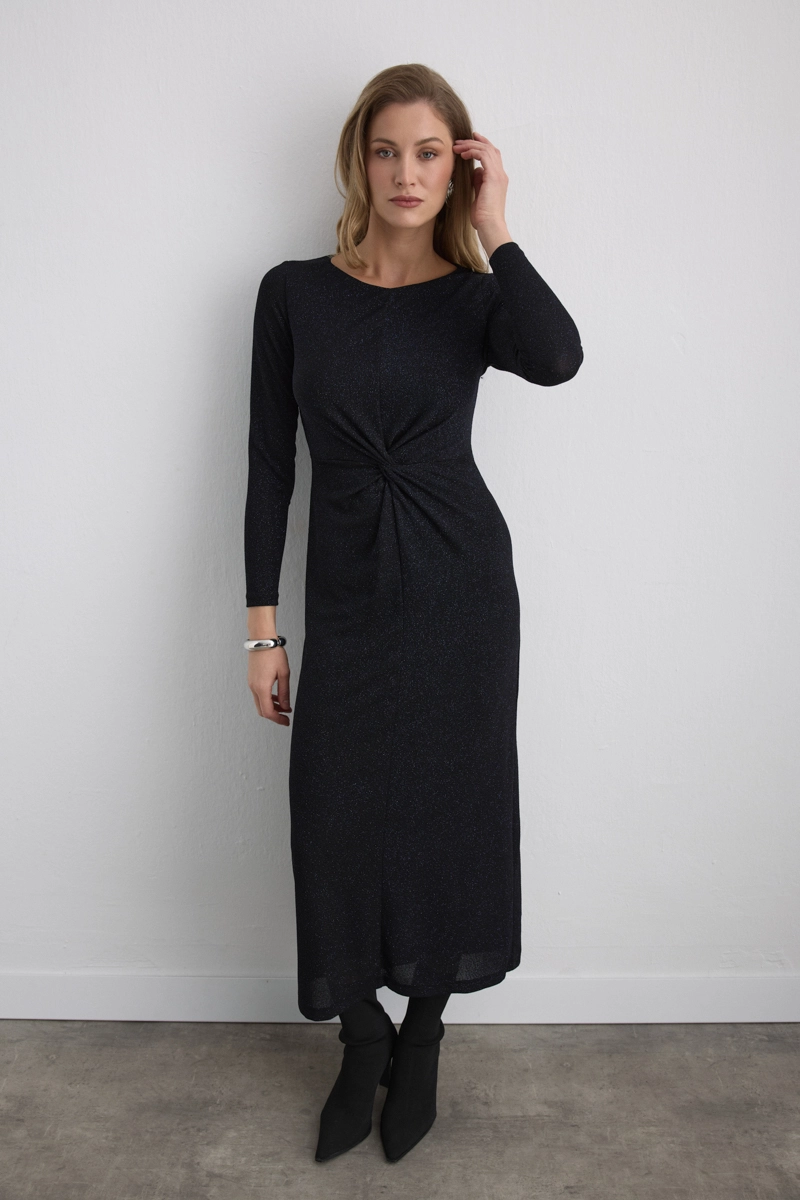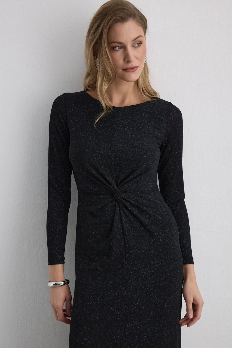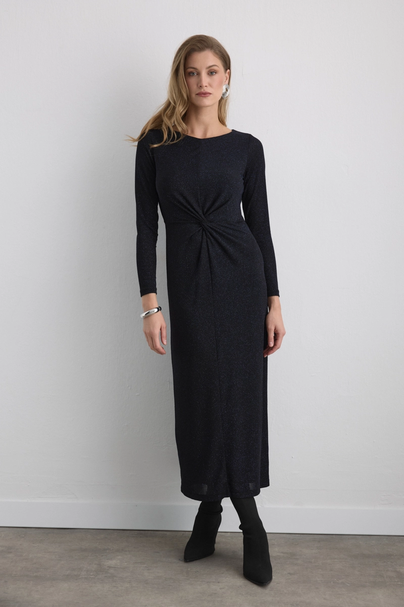 Combining the strong effect of cobalt blue with a shimmering texture, the fitted waist creates an elegant appearance. Its long cut provides a noble stance, offering eye-catching sophistication for special occasions.