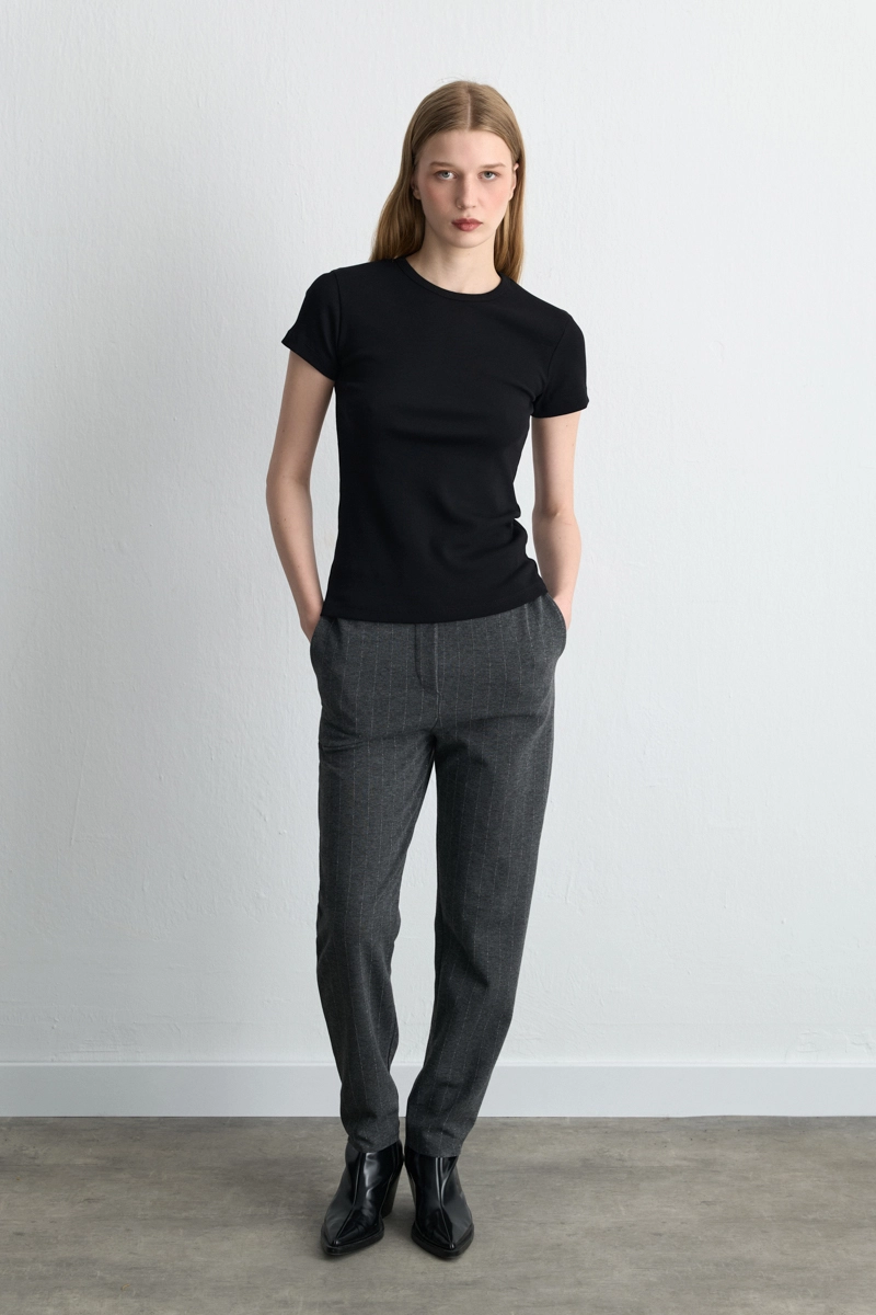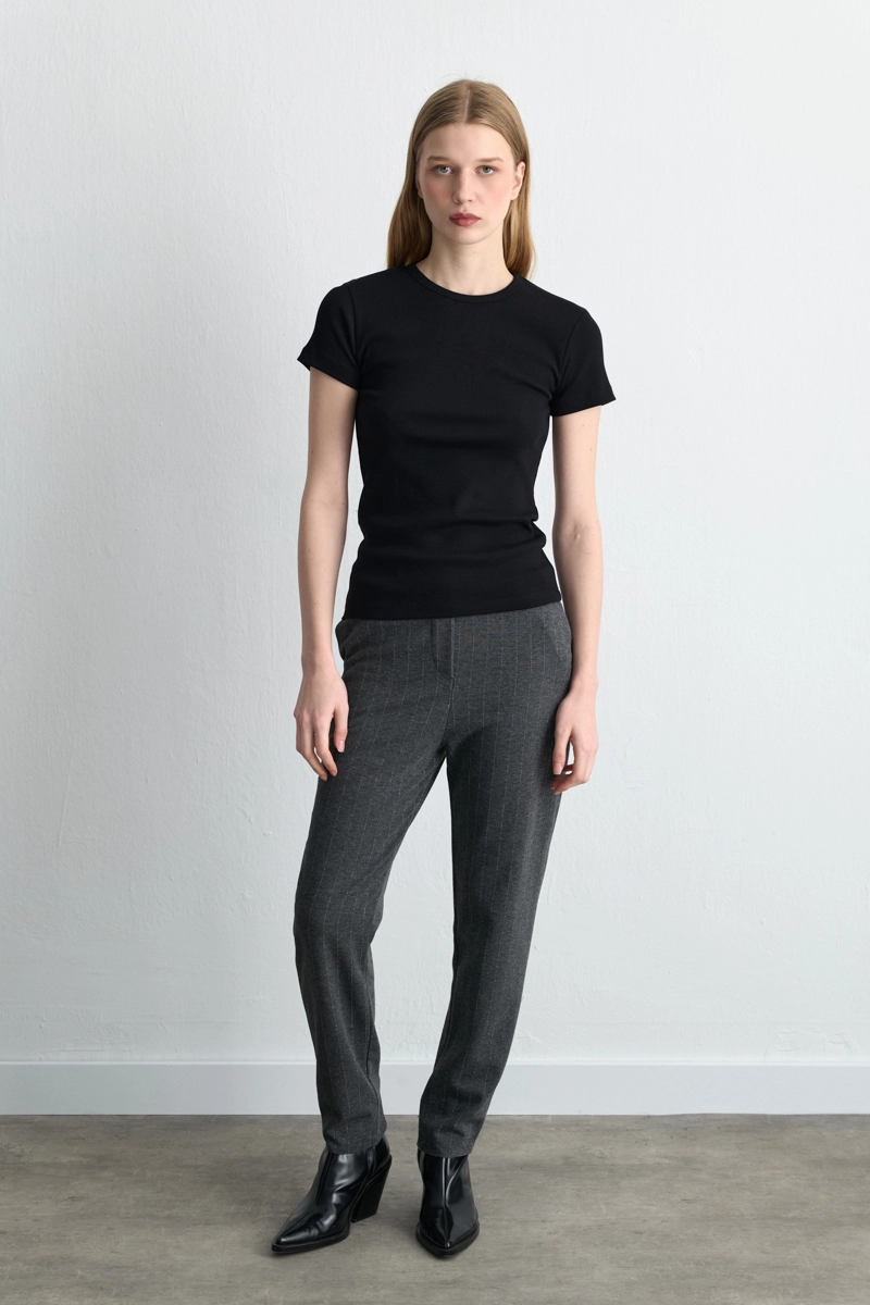 The gray tone matches any outfit. Its glitter-striped texture adds a modern and eye-catching detail to elegance. The knit structure provides flexible and comfortable wear. The straight cut creates a minimal silhouette. A refined piece that completes your style in daily and special combinations.