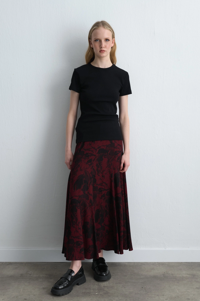 The short-sleeved basic T-shirt made of pure cotton offers a breathable structure and minimalist elegance with its black color. Its basic design makes it easy to pair with jeans, skirts, or shorts, becoming a wardrobe staple. Lightweight and soft, it stands out as one of the must-have pieces of the summer season.