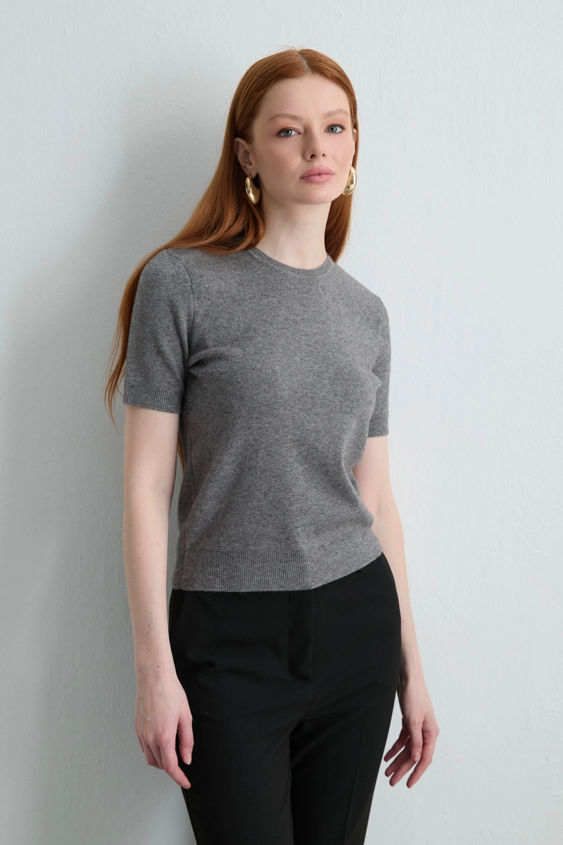 Gray short-sleeve knit blouse with a minimalist design is perfect for those who appreciate simple elegance. Its lightweight texture offers comfort during transitional seasons. Easily paired with any bottoms.