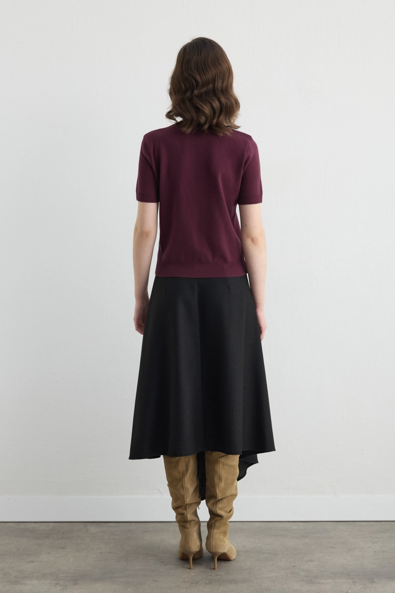 Soft knit fabric ensures comfort and completes everyday elegance. Burgundy tones add depth to fall and winter outfits. Short sleeves provide freedom of movement. Easily paired with simple pants or skirts. The soft color harmonizes with other pieces. Creates a relaxed and stylish look.