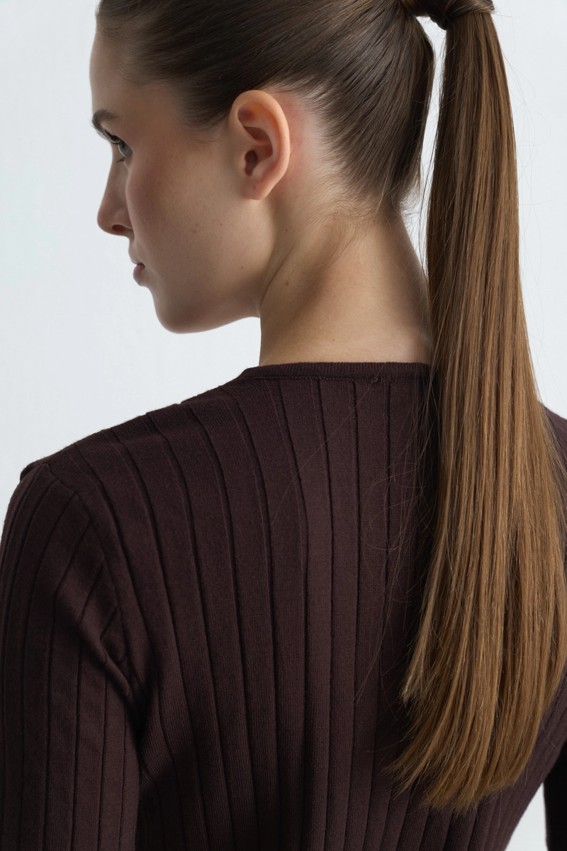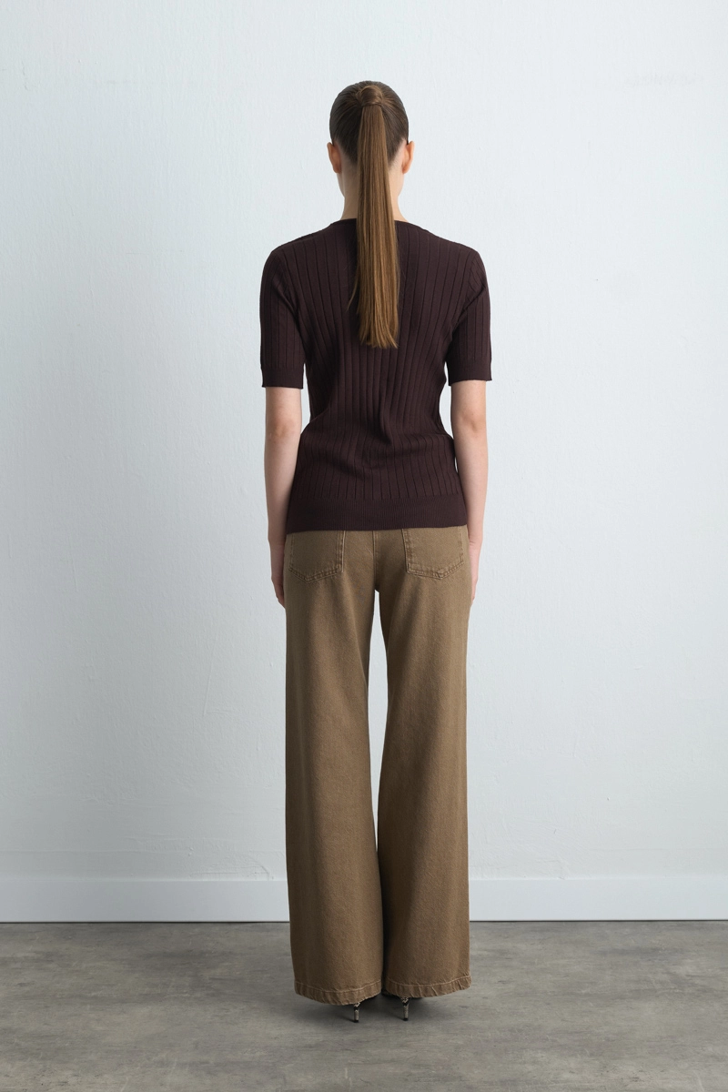 The Warm Brown Tone Provides Natural Elegance. The Ribbed Knit Adds A Modern Touch. Its Short-Sleeved Form Can Be Easily Used In Layered Outfits. Matches Both Day And Evening Styles.