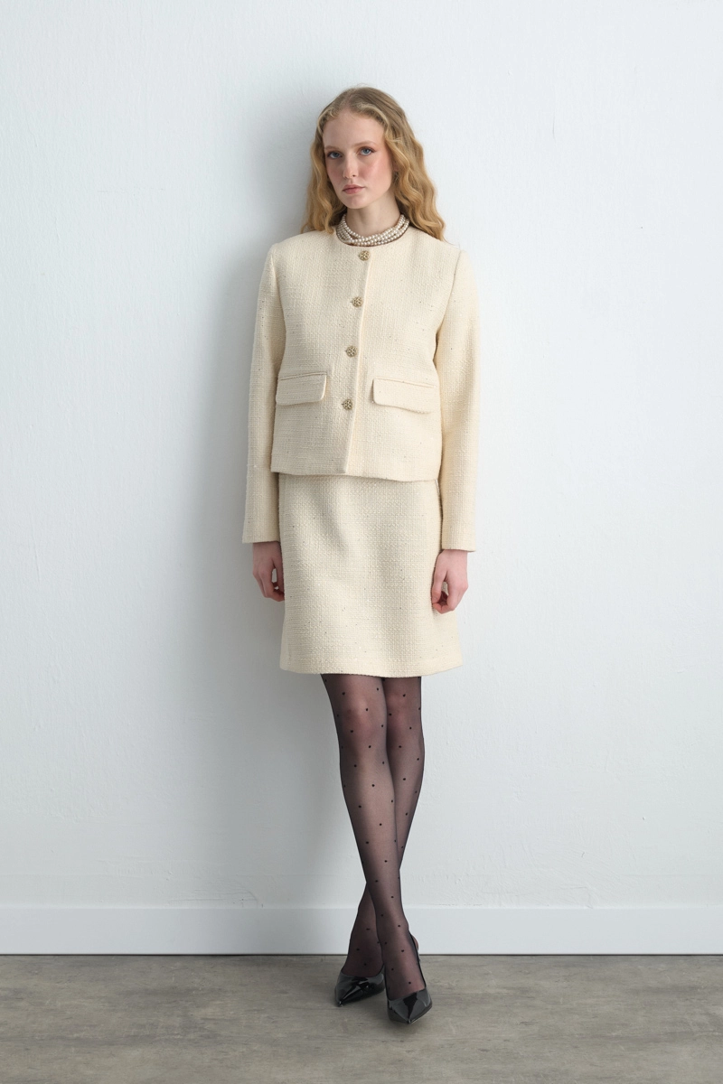 Its Twill Texture Offers A Classic And Elegant Look. The Short Sleeve Design Provides Comfort During Transitional Seasons. The Ecru Tone Creates A Simple And Sophisticated Silhouette. Suitable For Both Daily Wear And Special Occasions.