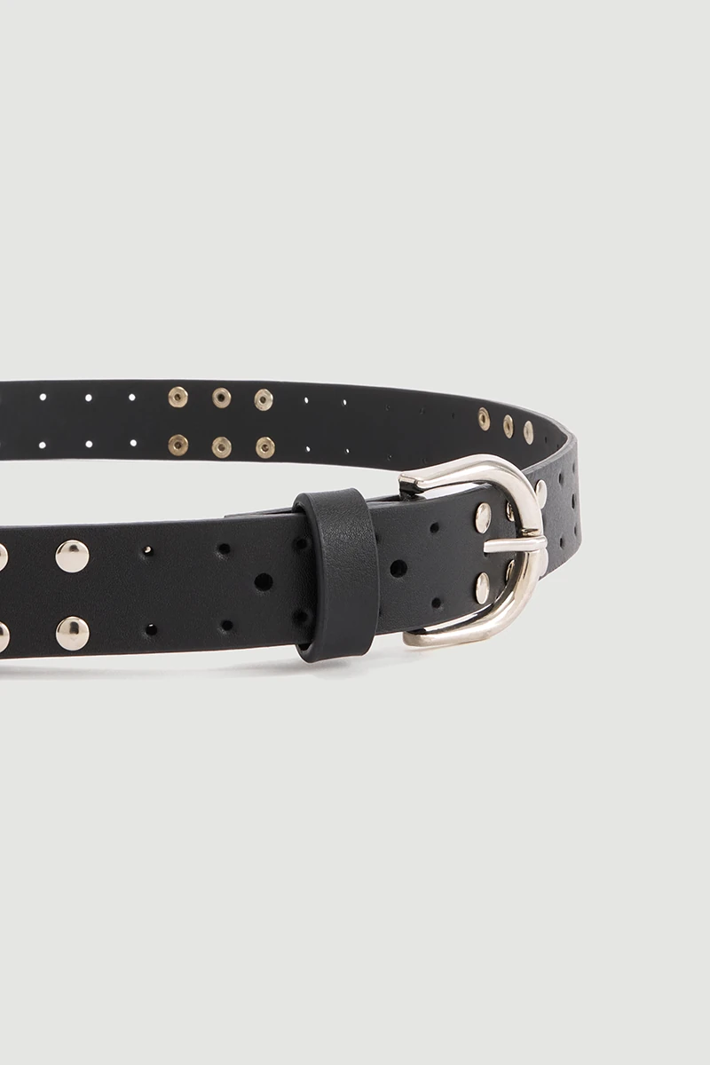 With its studded design, it offers a modern and strong style. Black leather-look creates a classic vibe. Silver buckle detail adds a striking appearance. Stands out in daily and alternative combinations.