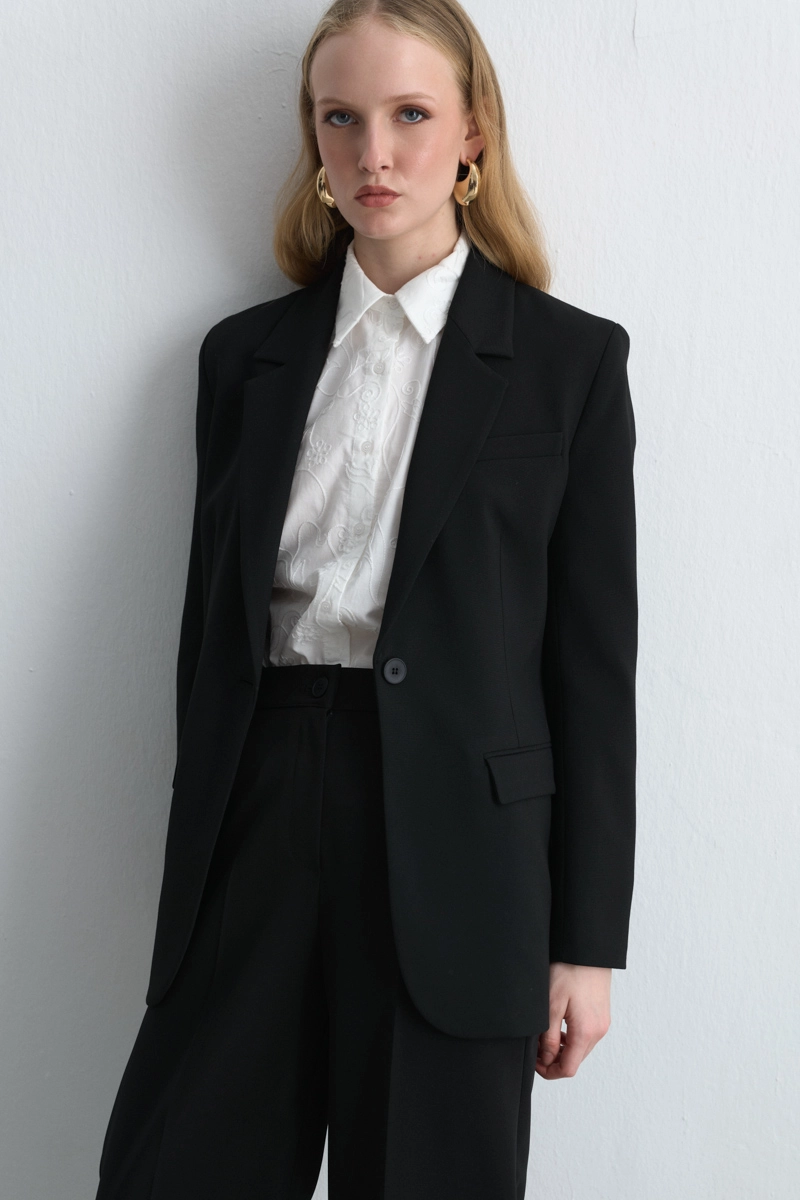 The black single-button blazer with a chic and timeless design can be worn both in professional settings and for casual elegance. Its classic cut adds sophistication to any outfit. A strong staple piece that will last in your wardrobe for years.