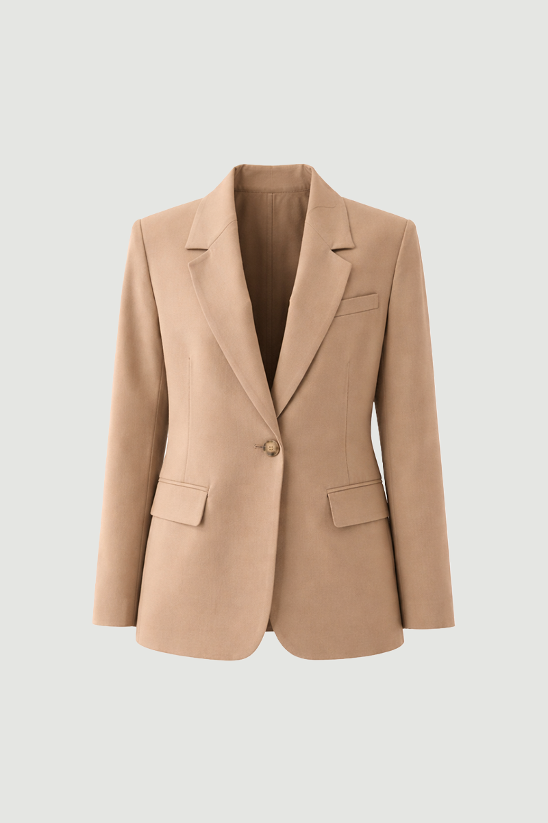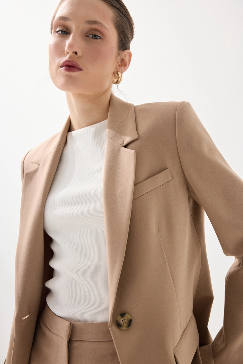 It offers timeless elegance with its classic cut. The single-button detail provides a simple and modern look. Its beige color creates soft and refined combinations. It is an ideal piece for both office and everyday style.