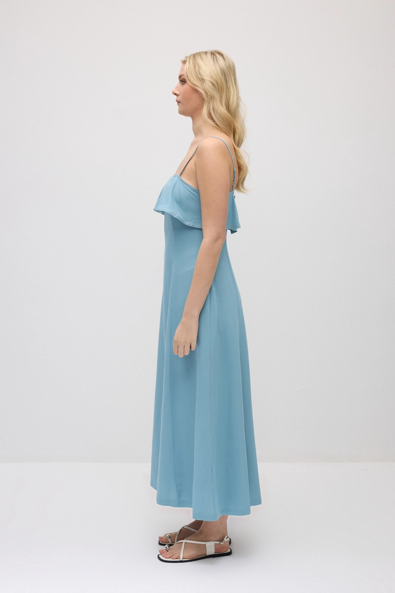 Cotton-linen blend fabric offers lightweight and breathable structure. Strap design adds a fresh touch to summer style. Front ruffle details create a dynamic appearance. Ideal choice for daily summer outfits.
