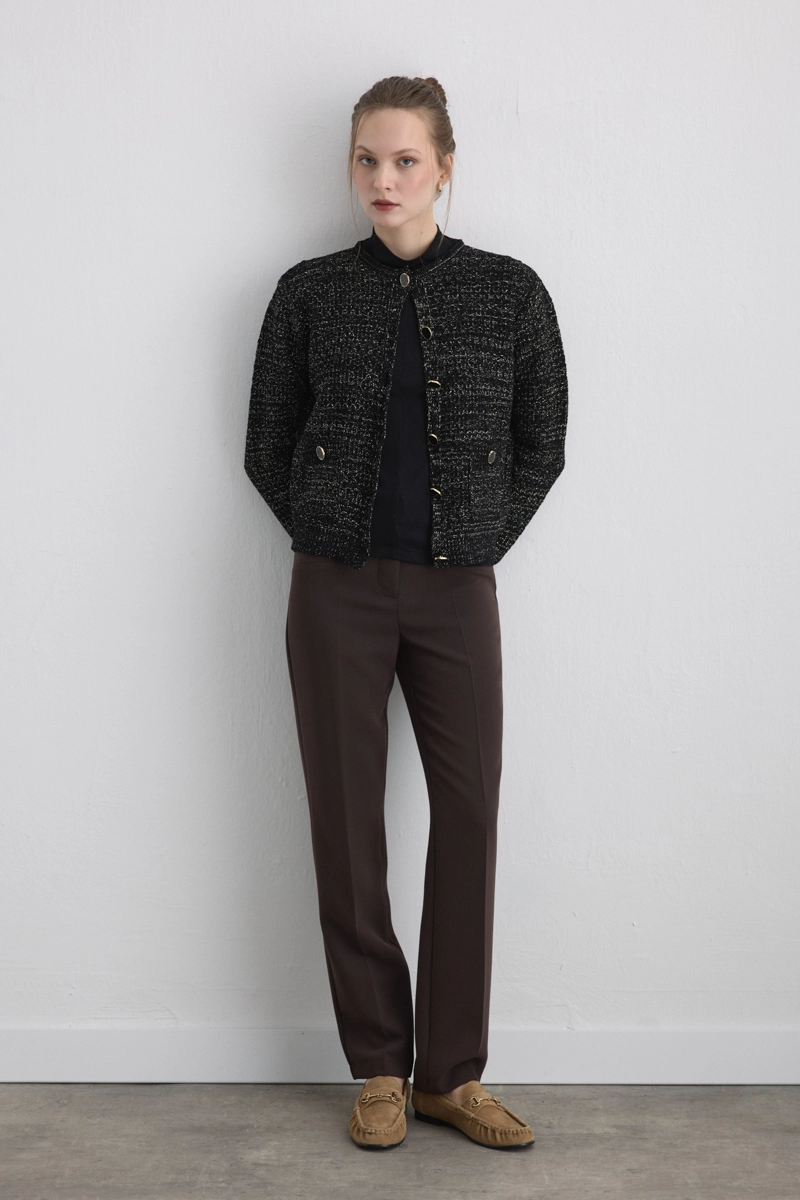 Glittery chenille threads reflect light with every movement. The relaxed fit and soft texture provide comfort. Suitable for both casual and evening outfits.