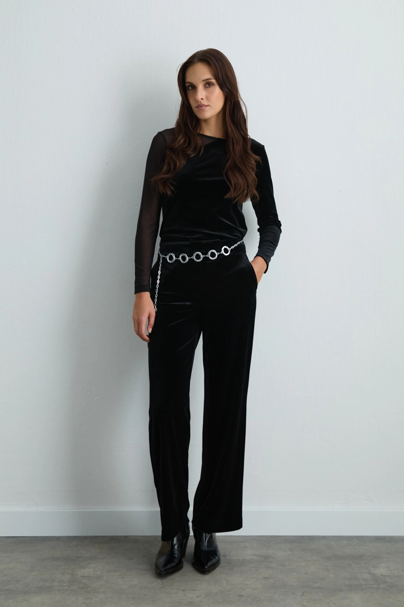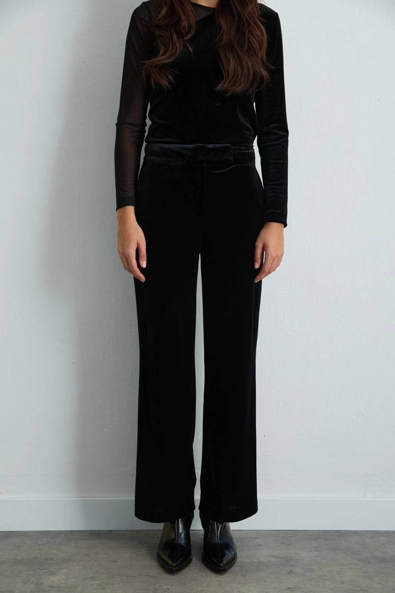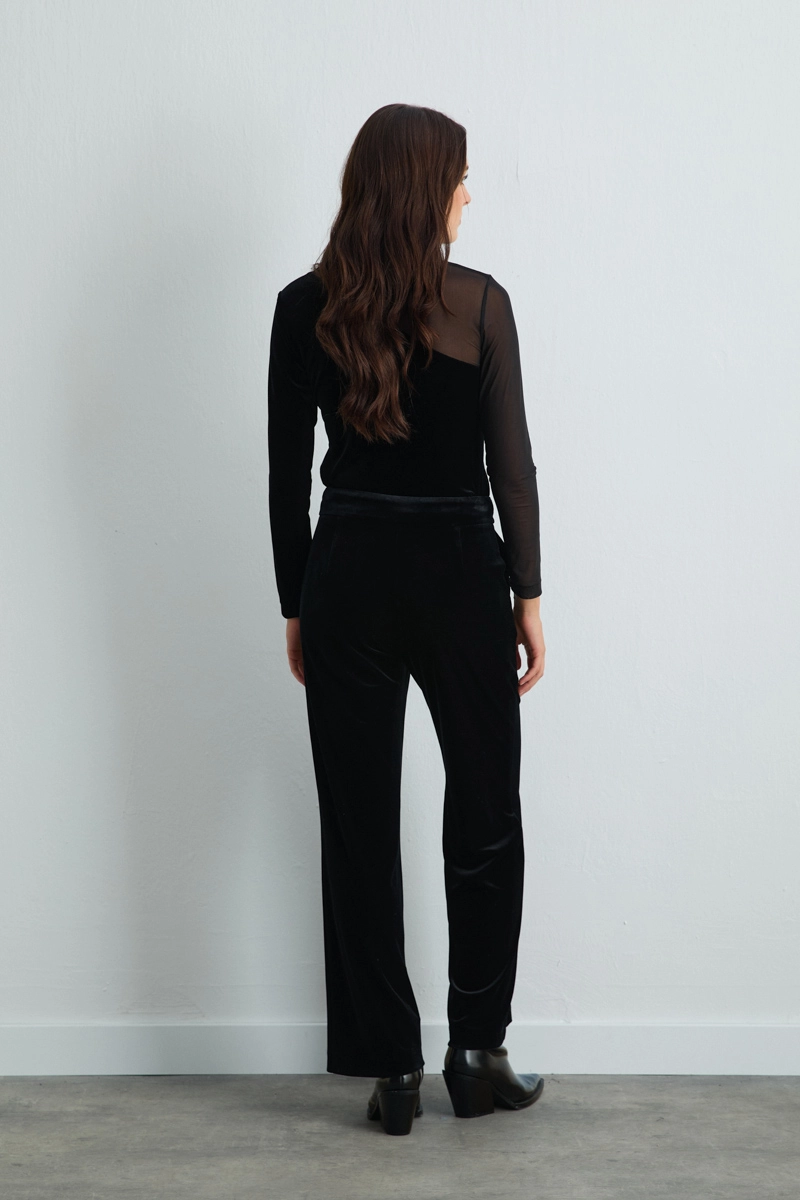 The black straight-leg velvet pants combine the refined texture of velvet with a classic fit. Perfect for special occasions or city chic outfits, they can be effortlessly styled with a simple blouse or shirt for a sophisticated look.