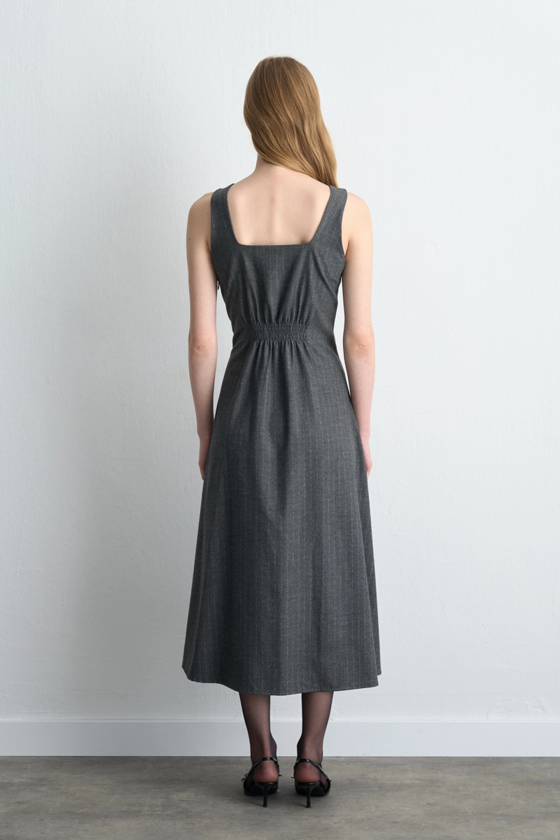 The gray tone provides a simple and modern look. The strap design creates an elegant appearance. The flowing fabric ensures comfortable wear. Its long length offers a feminine silhouette. A stylish alternative for daily or layered outfits.