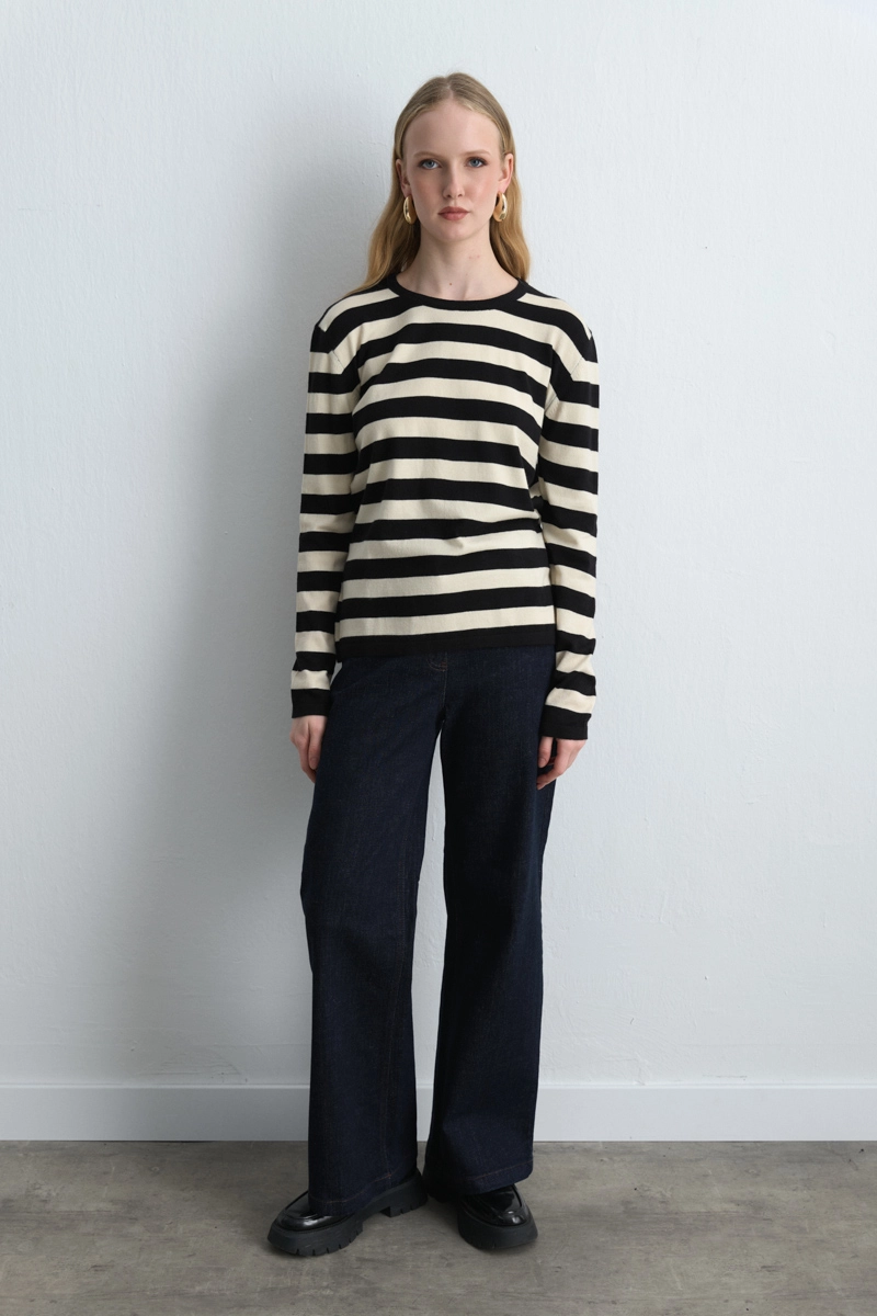 With its minimal and timeless striped pattern, the black basic knit blouse is set to become one of the most used pieces in your wardrobe. Easily paired with jeans or trousers for daily outfits. A versatile piece suitable for both casual and classic styling.