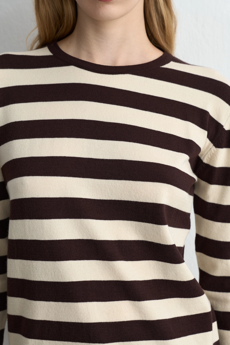 The brown tone offers a warm and simple style. Its striped pattern adds a minimalist touch. The knit fabric provides a lightweight and comfortable wear. The basic cut adapts to versatile outfits. It stands out as a modern and comfortable choice that complements everyday elegance.